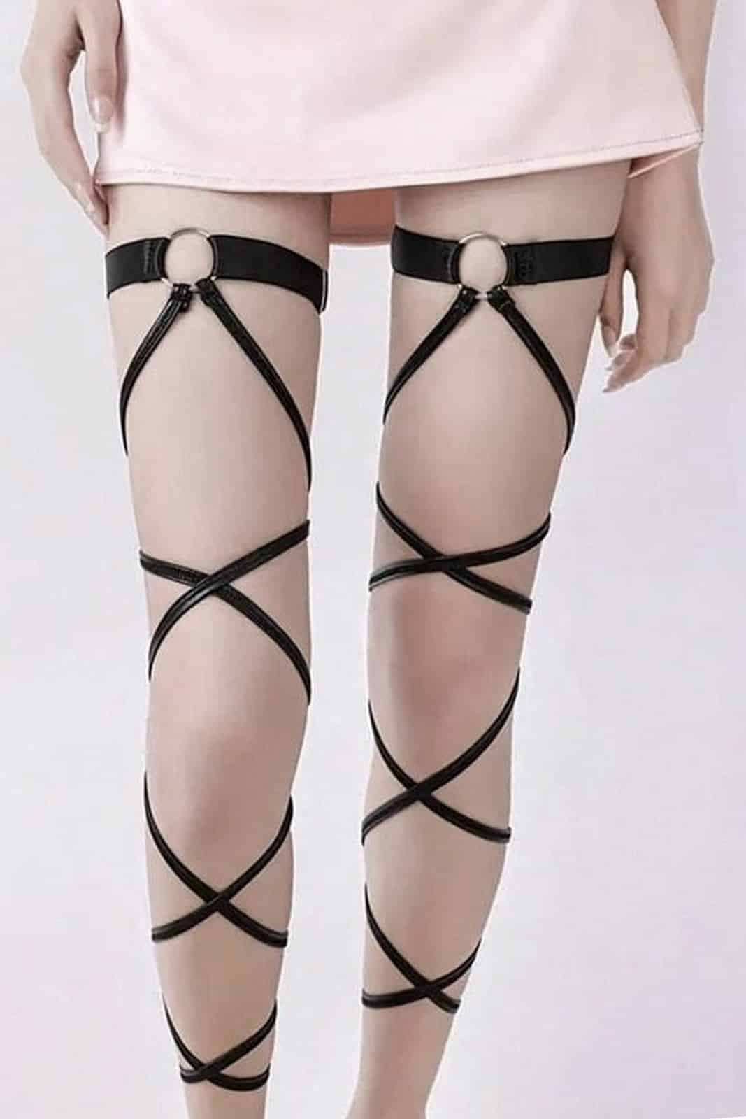 Schwarzes Strumpfband in verstellbarer Länge mit einer leicht glänzenden Schnürverlängerung zum Anlegen ans Bein.