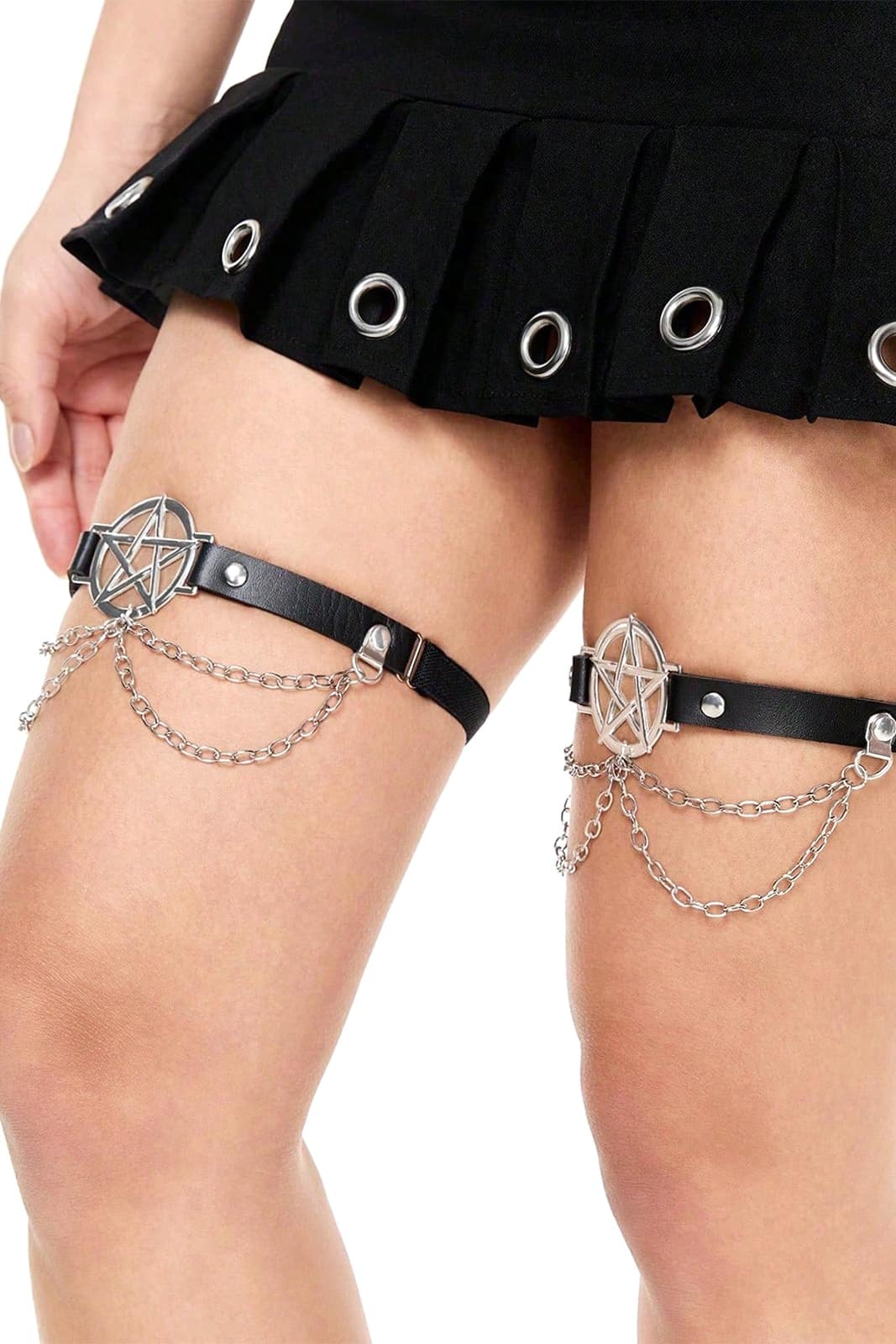 Markantes Gothic-Strumpfhalter-Set mit auffälligen Pentagramm-Motiven aus Metall, kombiniert mit filigranen Ketten und schmalen schwarzen Riemen. Das Design verbindet okkulte Symbolik mit klarer Linienführung und verleiht jedem Outfit eine düstere, selbstbewusste Note. Ideal als stilvoller Akzent zu Röcken, Kleidern oder Lingerie im Gothic- und Witchy-Stil.