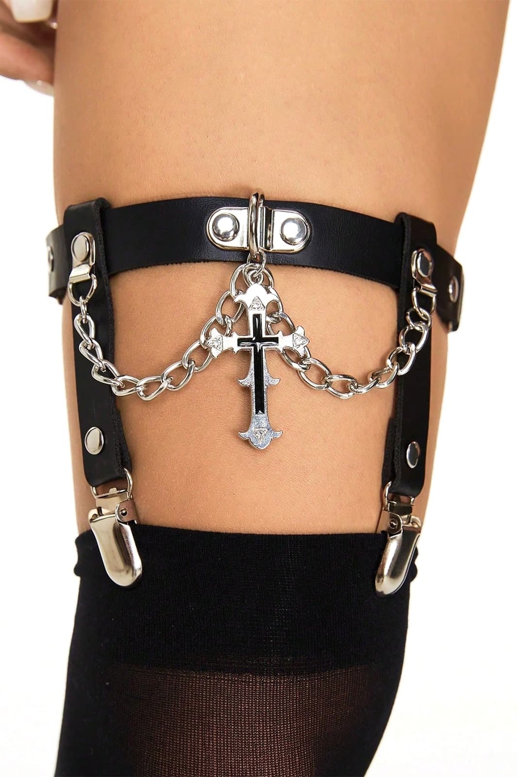 Schwarzes Strumpfhalter-Paar im Gothic-Style mit verstellbaren Kunstlederriemen, silberfarbener Kette und zentralem Kreuzanhänger. Die Kombination aus klaren Linien, Metallbeschlägen und religiöser Symbolik verleiht dem Design eine düster-elegante, provokante Ausstrahlung – ideal für Gothic, Occult und Dark Fashion Looks.