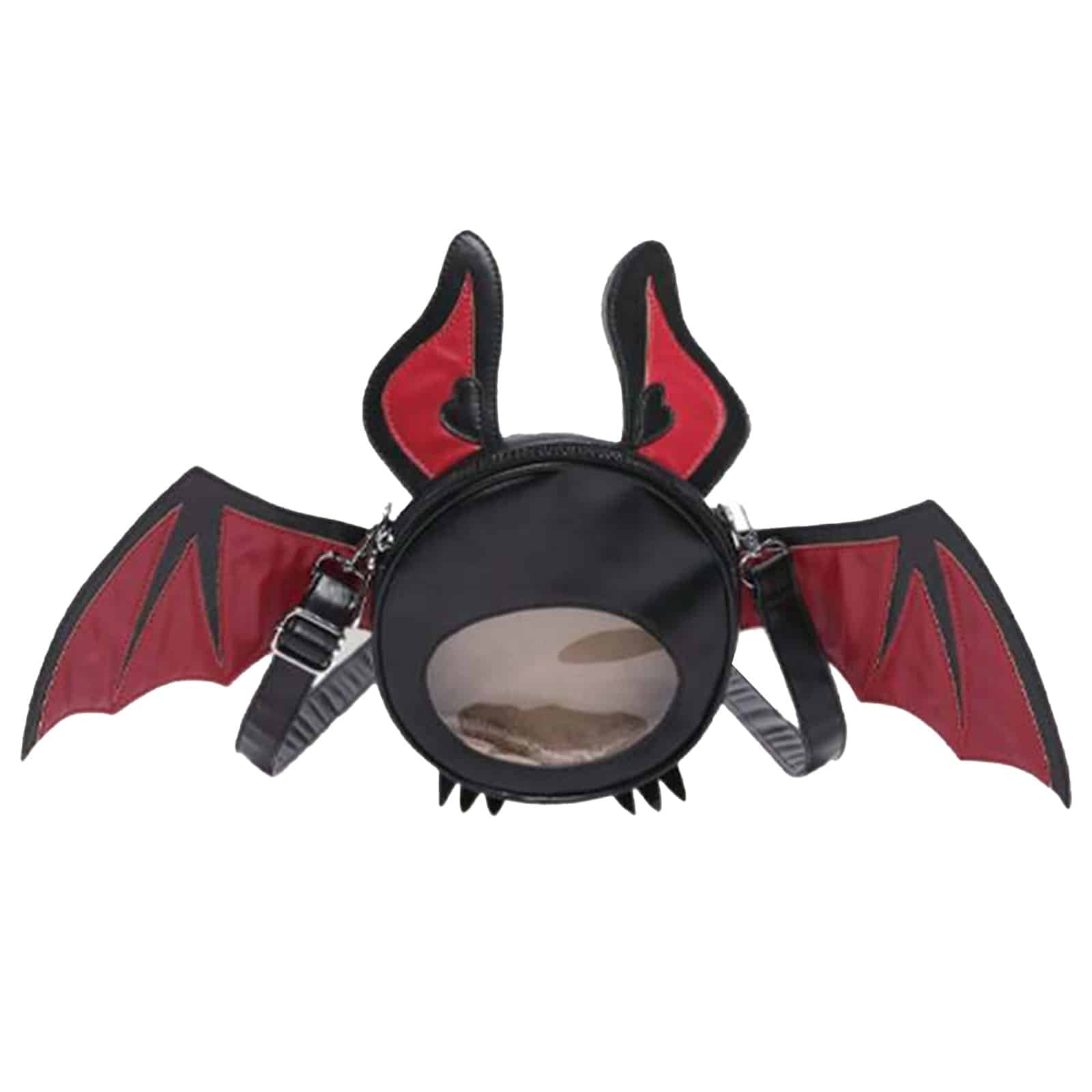 Verspielte Tasche aus hochwertigem Kunstleder mit breiten Fledermausflügeln und süßen Ohren. Vorn mit durchsichtigem Sichtfenster.