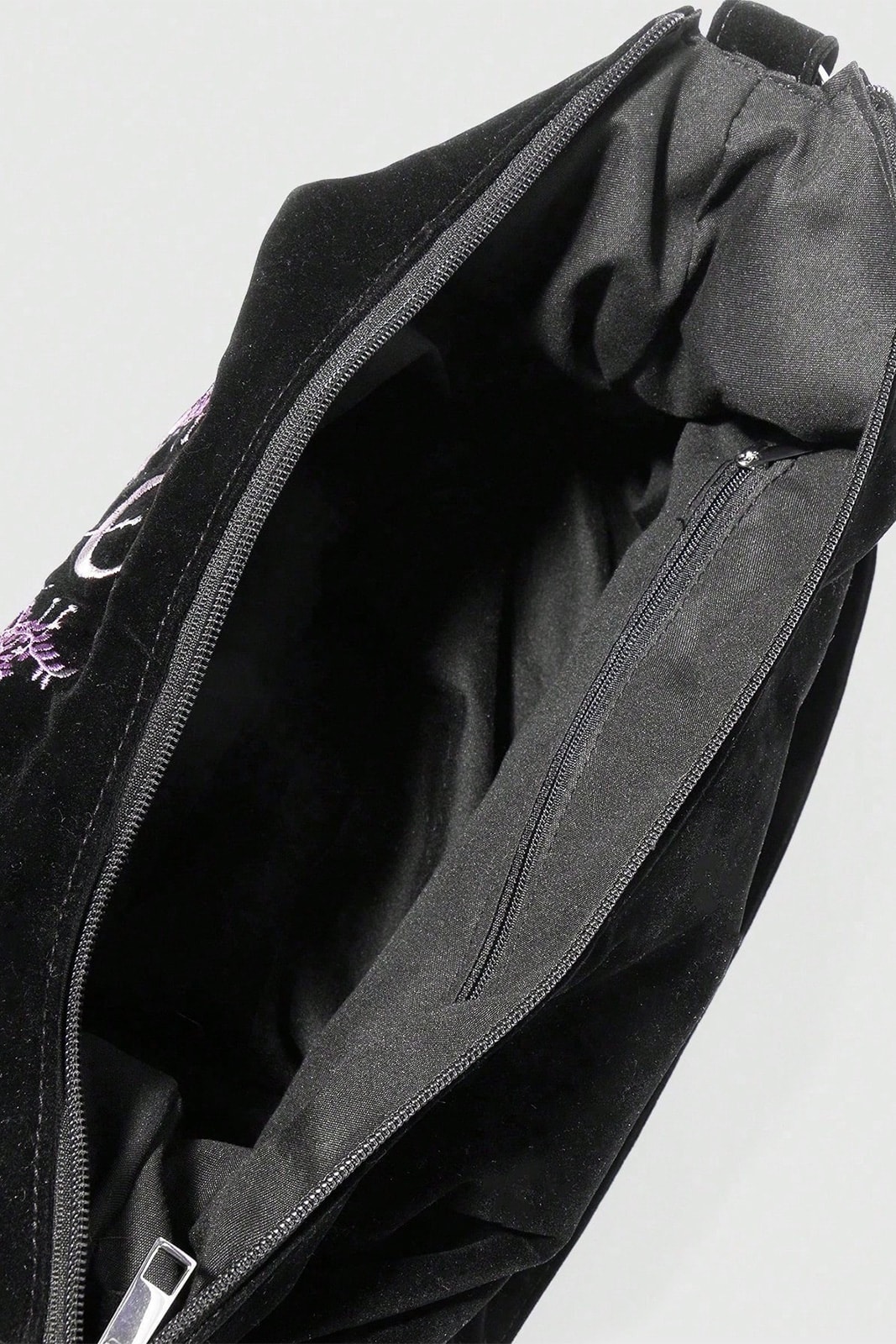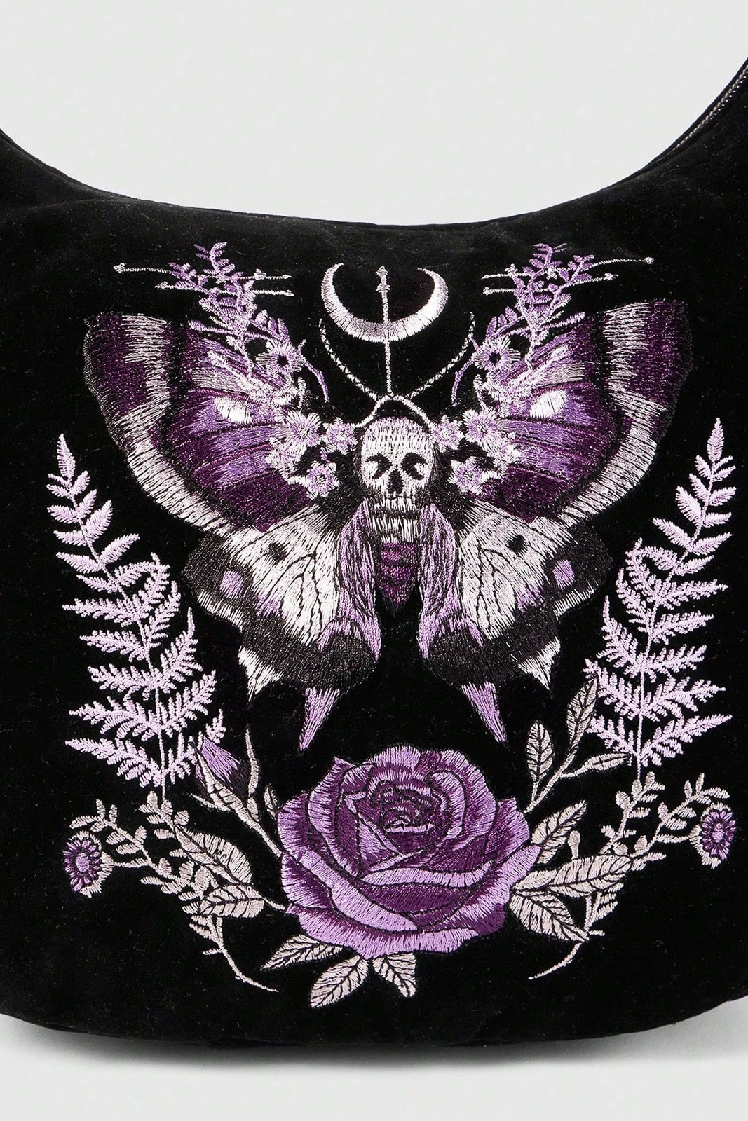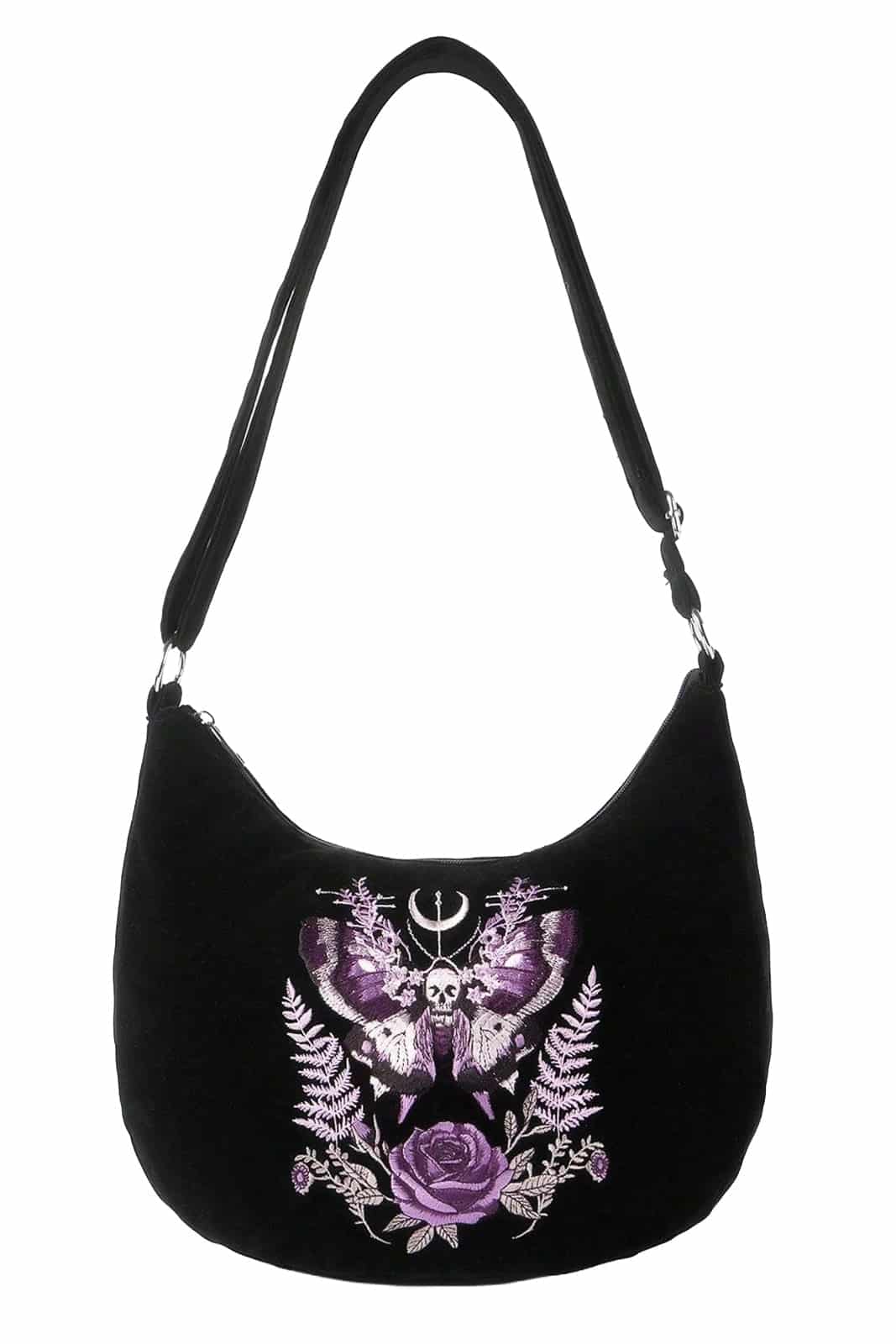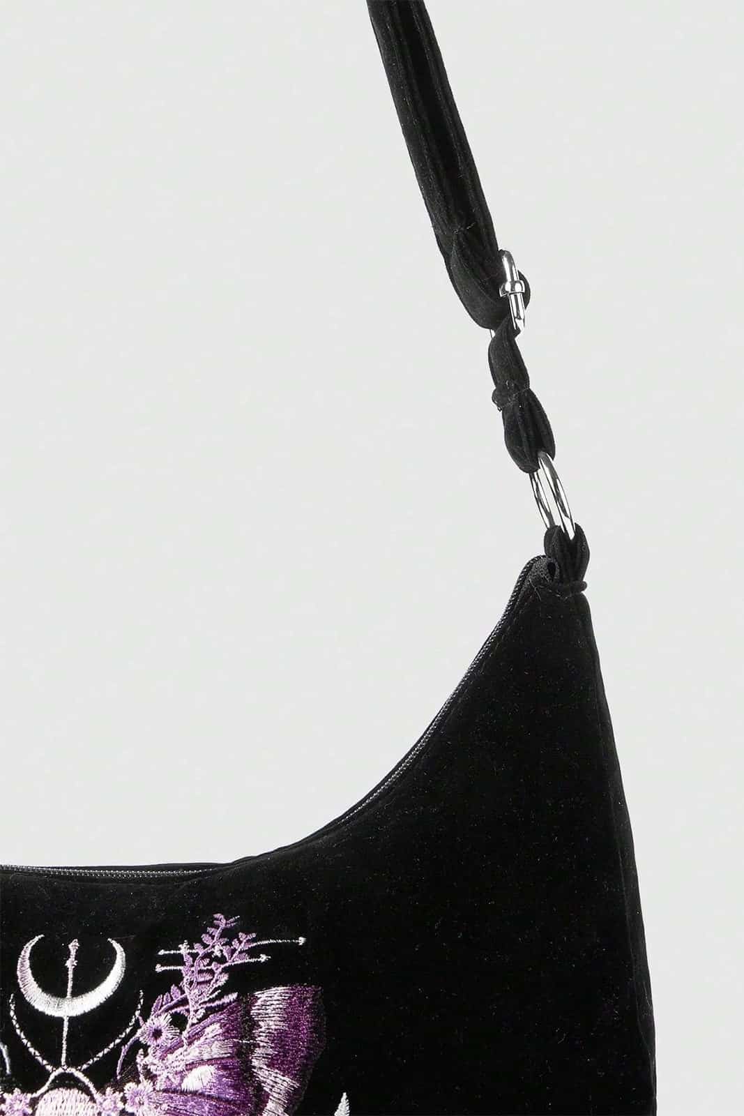 Eine ausdrucksstarke Schultertasche mit Dark-Romantic-Aura und hochwertiger Verarbeitung. Das aufwendig gestickte Frontmotiv zeigt eine mystische Motte mit Totenschädel, umrahmt von floralen Elementen und okkulter Symbolik – eine kraftvolle Verbindung aus Natur, Vergänglichkeit und Ritualästhetik. Die Moth Sigil Velvet Bag verbindet dieses markante Design mit weichem Samtmaterial und alltagstauglicher Funktionalität. Elegant, düster und charakterstark – ideal für Gothic-, Witchy- und Alternative-Looks.