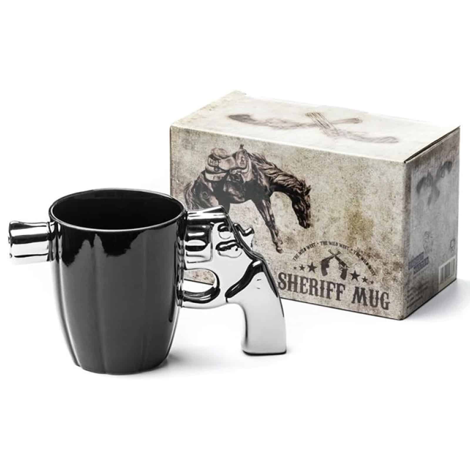 Es muss Ordnung herrschen und jemand sollte das Sagen haben. Wenn sich also Chaos auf Ihren Schreibtischen und Gesetzlosigkeit in Ihren Büros ausbreitet, suchen Sie nach jemandem, der Kaffee aus der Tasse eines Sheriffs trinkt, denn er muss ein wirklich harter Kerl sein und nur er kann die Ordnung wiederherstellen. Eine tolle Tasse für bestimmte Leute, die fest auf dem Boden bleiben und sich nicht beschweren, sondern sich lieber eine unserer Sheriff-Tassen erschießen. Gadget im Detail: Eine Sheriff-Tasse aus Keramik für diejenigen, die keine Witze machen eine Tasse und ein Schreibtischgerät, auf dem steht, wer hier wirklich das Sagen hat ein ausgefallenes Geschenk nicht nur für harte Kerle oder Militärfans Die Farbe der Tasse ist schwarz, die Farbe des Revolvers ist silbern.