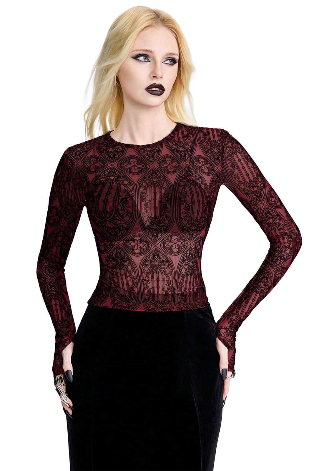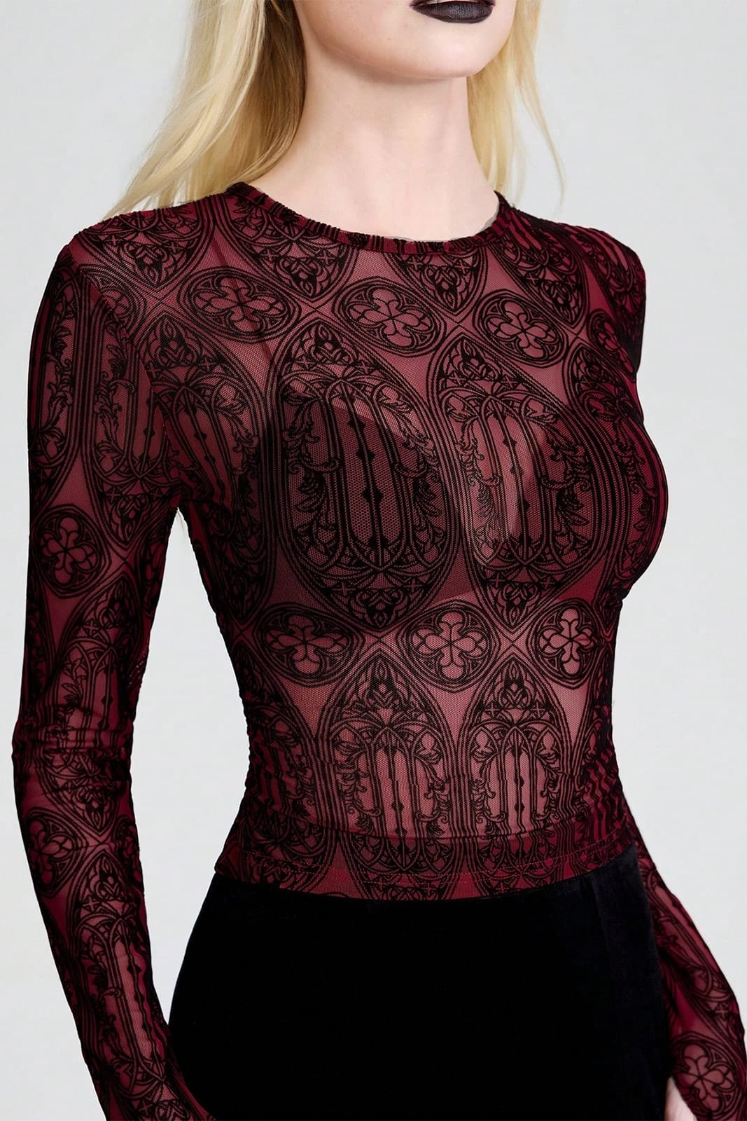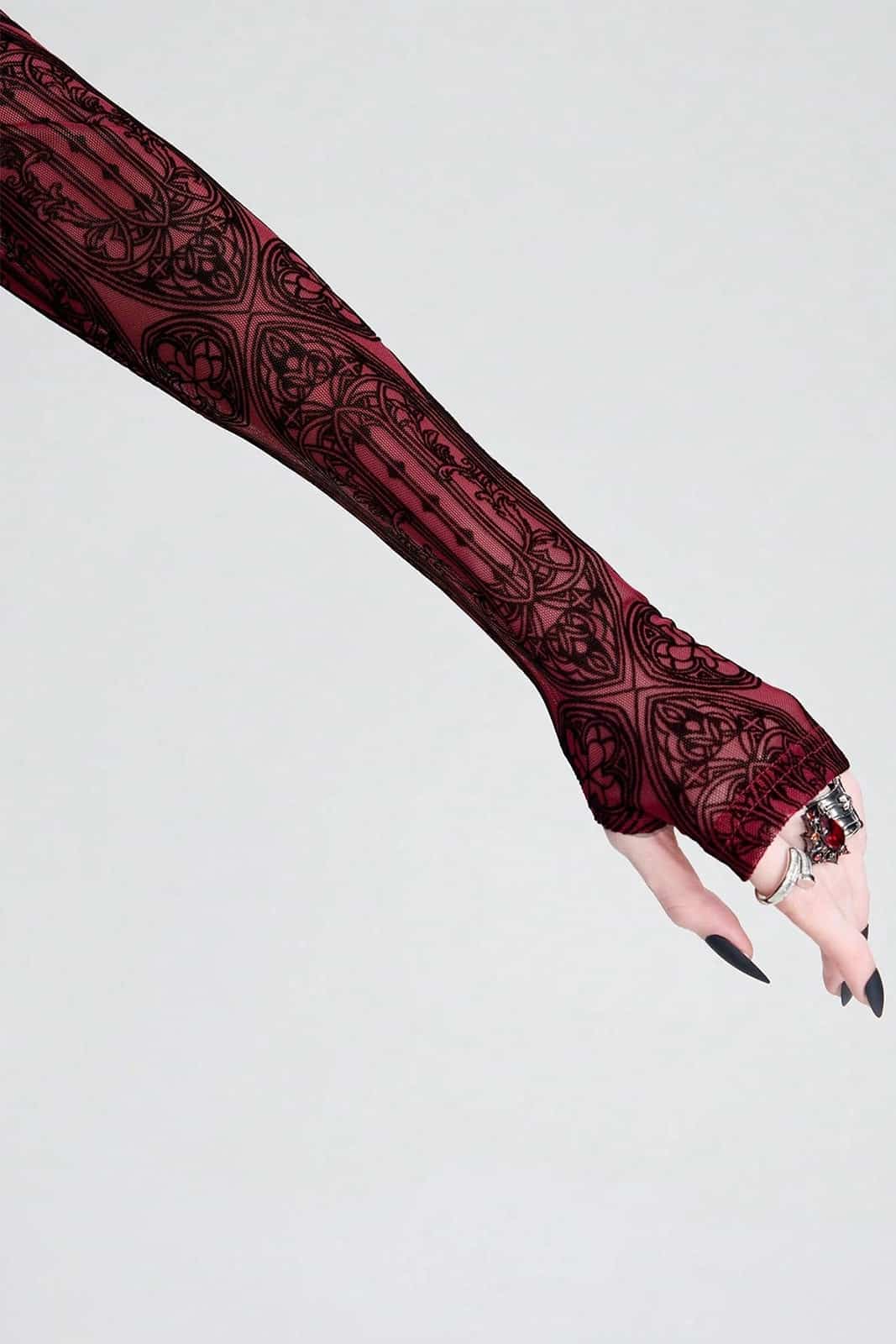 Ein körpernah geschnittenes, leicht transparentes Mesh-Top mit einem ornamentalen Muster, das an gotische Fensterrosetten und sakrale Architektur erinnert. Die tiefrote Basis trifft auf filigrane, dunkle Linien und erzeugt einen eleganten, zugleich düsteren Look, der subtil Haut durchscheinen lässt und jedem Outfit eine sinnliche Gothic-Note verleiht.