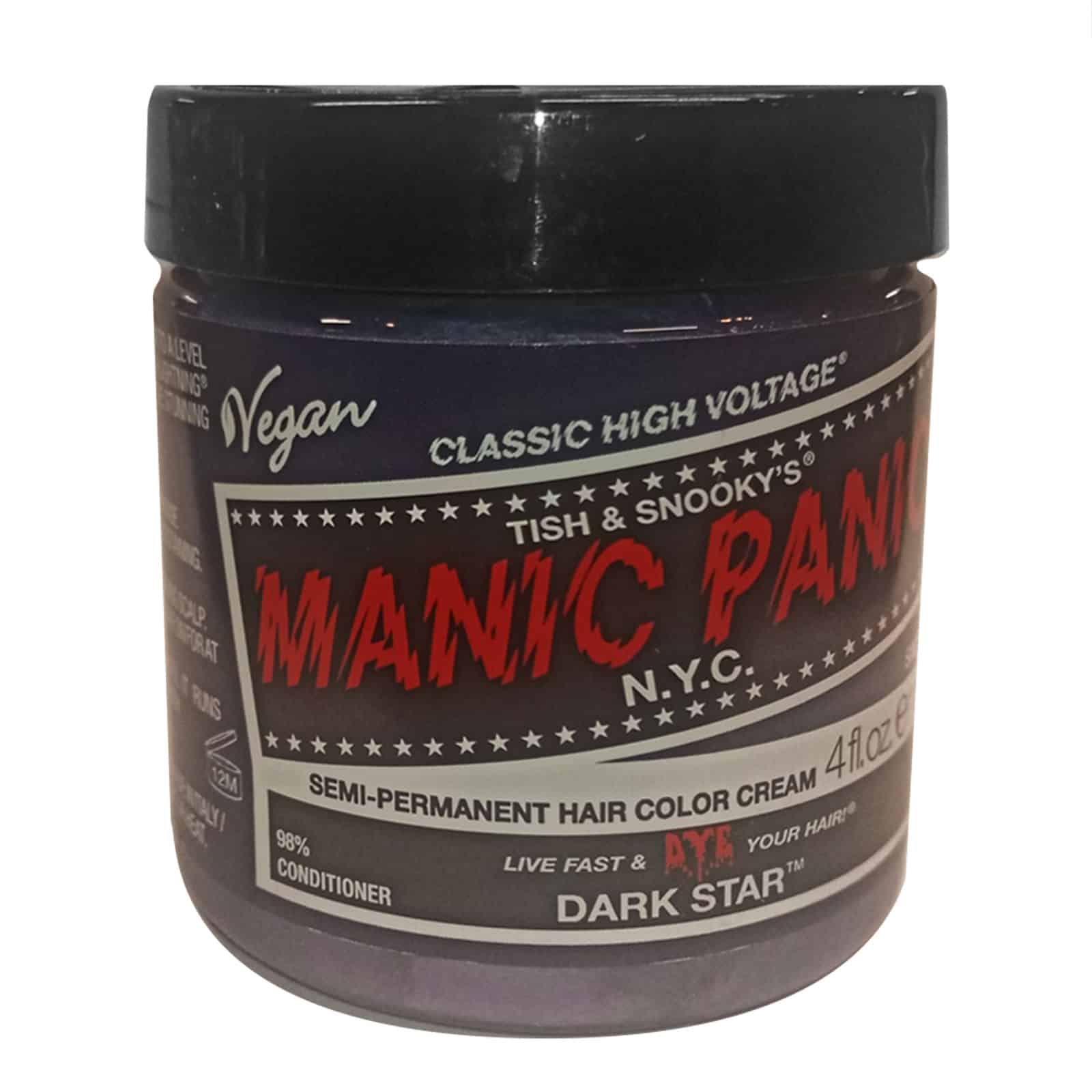 Manic Panic Dark Star ist ein heller Grauton, der Silbertöne mit Flieder kombiniert, um einen wunderschönen lila schattierten grauen Farbstoff zu schaffen.