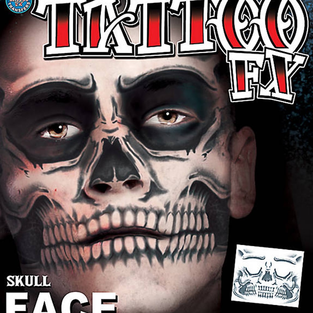 Temporäres Totenkopf-Tattoo für das Gesicht. Realistisches Design und einfache Anwendung. Anleitung in englisch.
