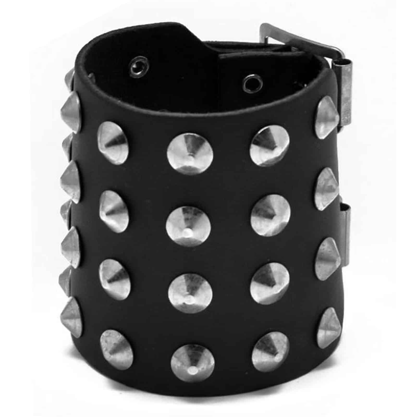 Schlichtes Armband aus Rindsleder mit klassischer Schnalle. Besetzt mit vier Reihen Spitznieten.