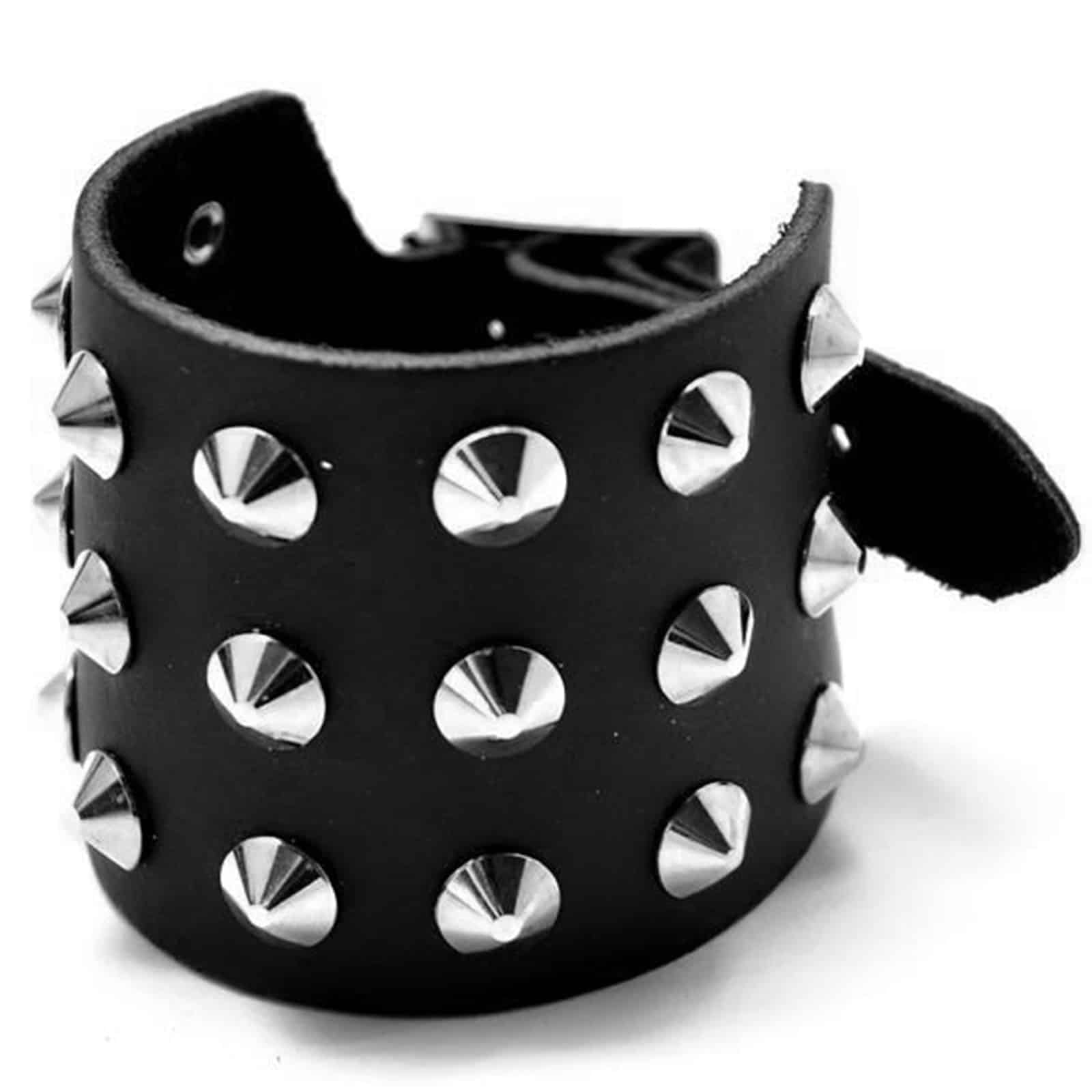 Schlichtes Armband aus Rindsleder mit klassischer Schnalle. Besetzt mit drei Reihen Spitznieten.