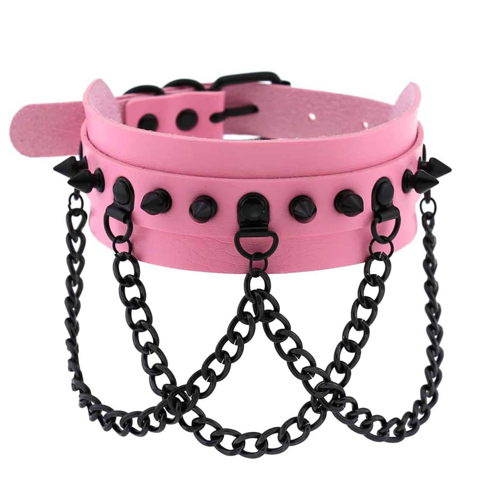 Zweilagiges Kunstlederhalsband verziert mit schwarzen Spitznieten und schwarzen Ketten.