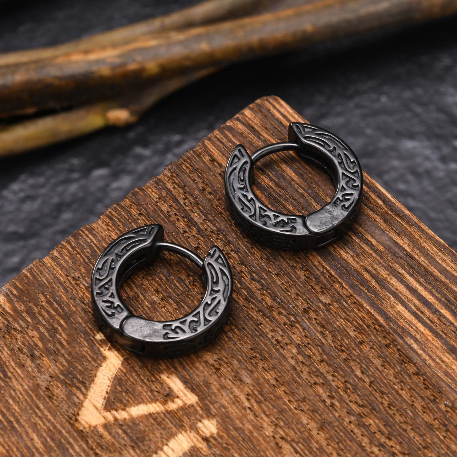 Dunkle Creolen mit fein eingravierten, runenartigen Ornamenten, die sofort eine mystische, nordisch inspirierte Ausstrahlung erzeugen. Die kompakte Form sorgt für angenehmen Tragekomfort, während das detailreiche Design ein starkes Statement setzt. Ideal für Gothic-, Viking-, Pagan- und alternative Looks – kraftvoll, geheimnisvoll und absolut charakterstark.
