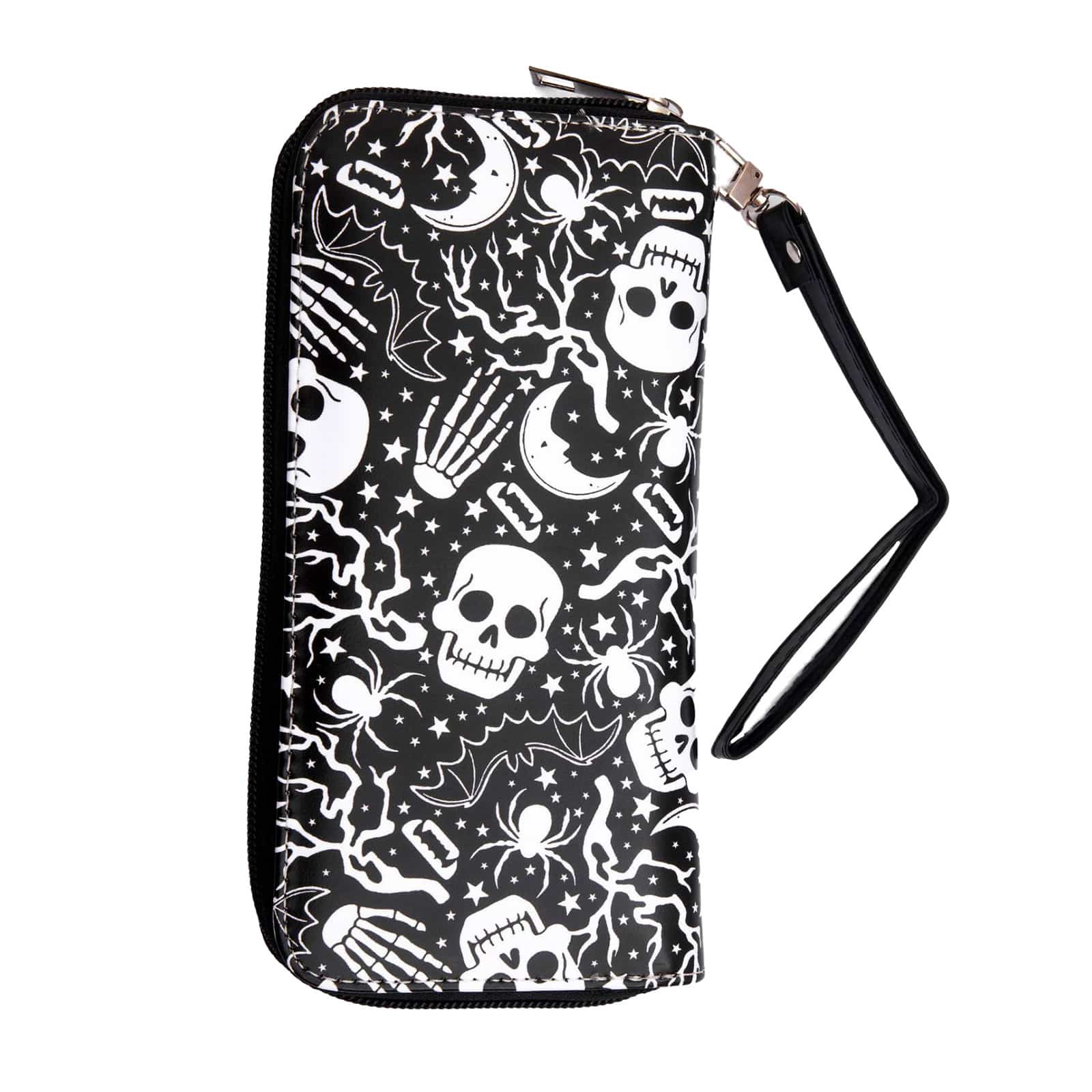 Große Geldbörse mit Allover Gothic Motiv aus Schädeln, Fledermäusen und Spinnen