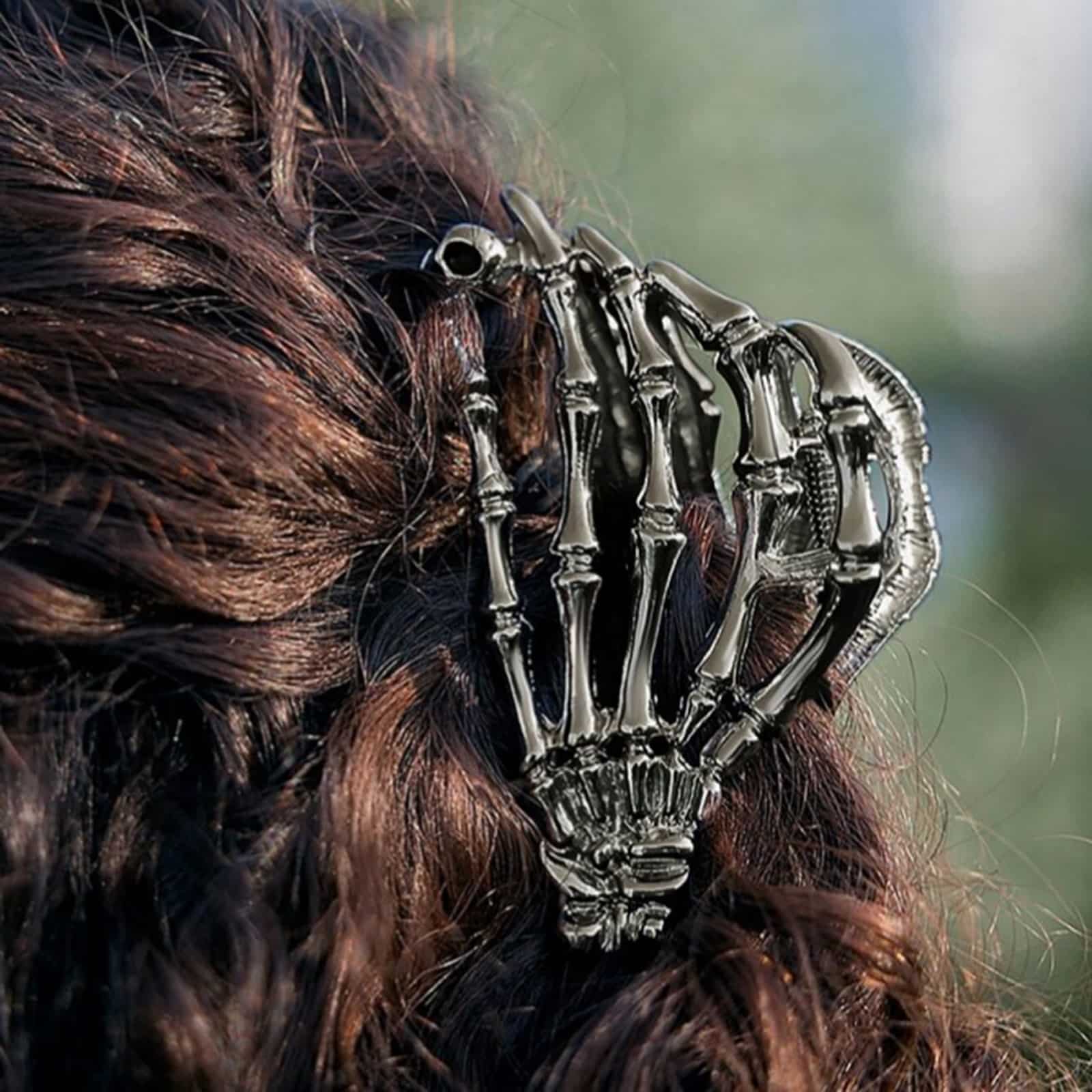 Schwarze Haarklammer in Form zweier Skeletthände.