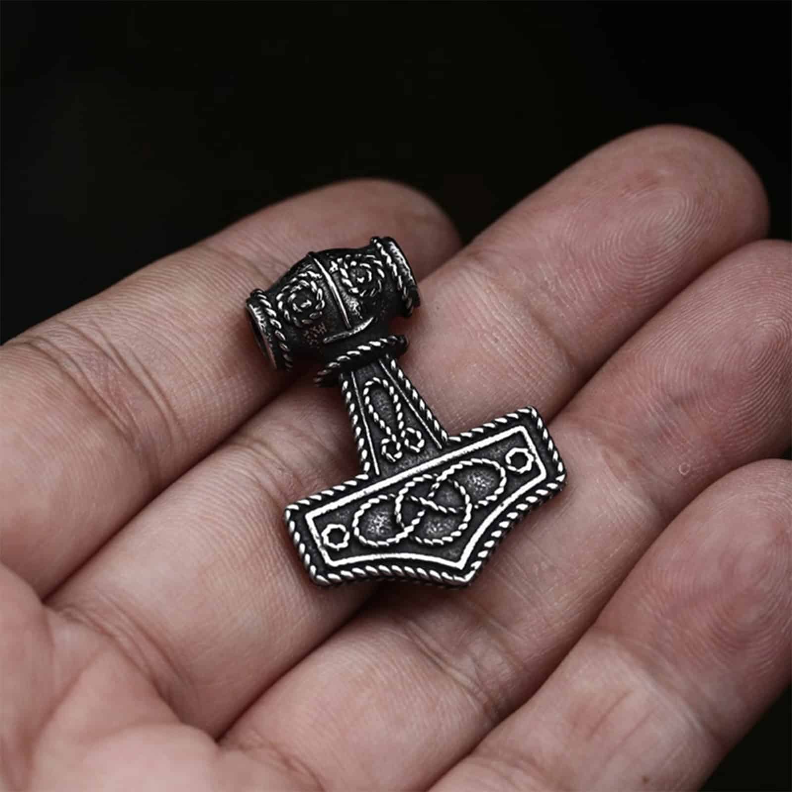 Detailreich verzierter Mjölnir-Anhänger im klassischen nordischen Stil. Die kunstvollen Gravuren und das gealterte Metallfinish verleihen dem Hammer des Thor eine kraftvolle, authentische Ausstrahlung. Ein symbolträchtiges Schmuckstück für Viking-, Pagan-, Gothic- und alternative Looks – ideal als Schutzsymbol, Talisman oder markanter Hingucker.
