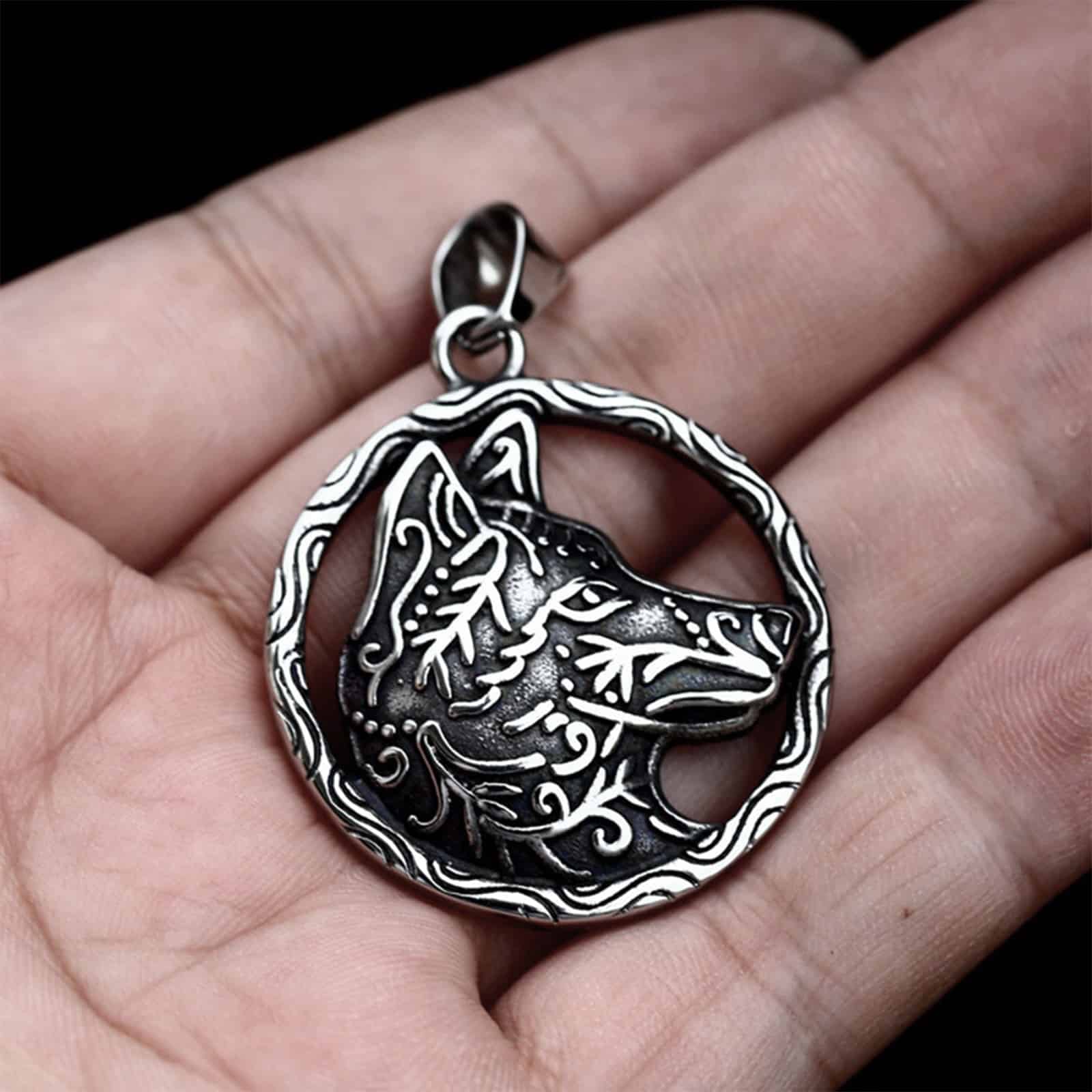 Detailreicher Anhänger mit kunstvoll verziertem Wolfskopf, eingerahmt von einem filigran gemusterten Kreis. Die organischen Linien und Ornamente verleihen dem Design eine mystische, naturverbundene Ausstrahlung – ein Symbol für Instinkt, Stärke und spirituelle Führung. Perfekt für Pagan-, Viking-, Boho- und Gothic-Looks.