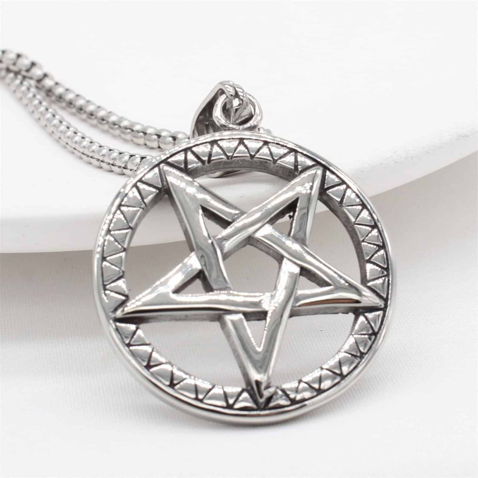 Detaillierter Anhänger eines Pentagramms. Gefertigt aus rostfreiem Stahl inklusive Kette.