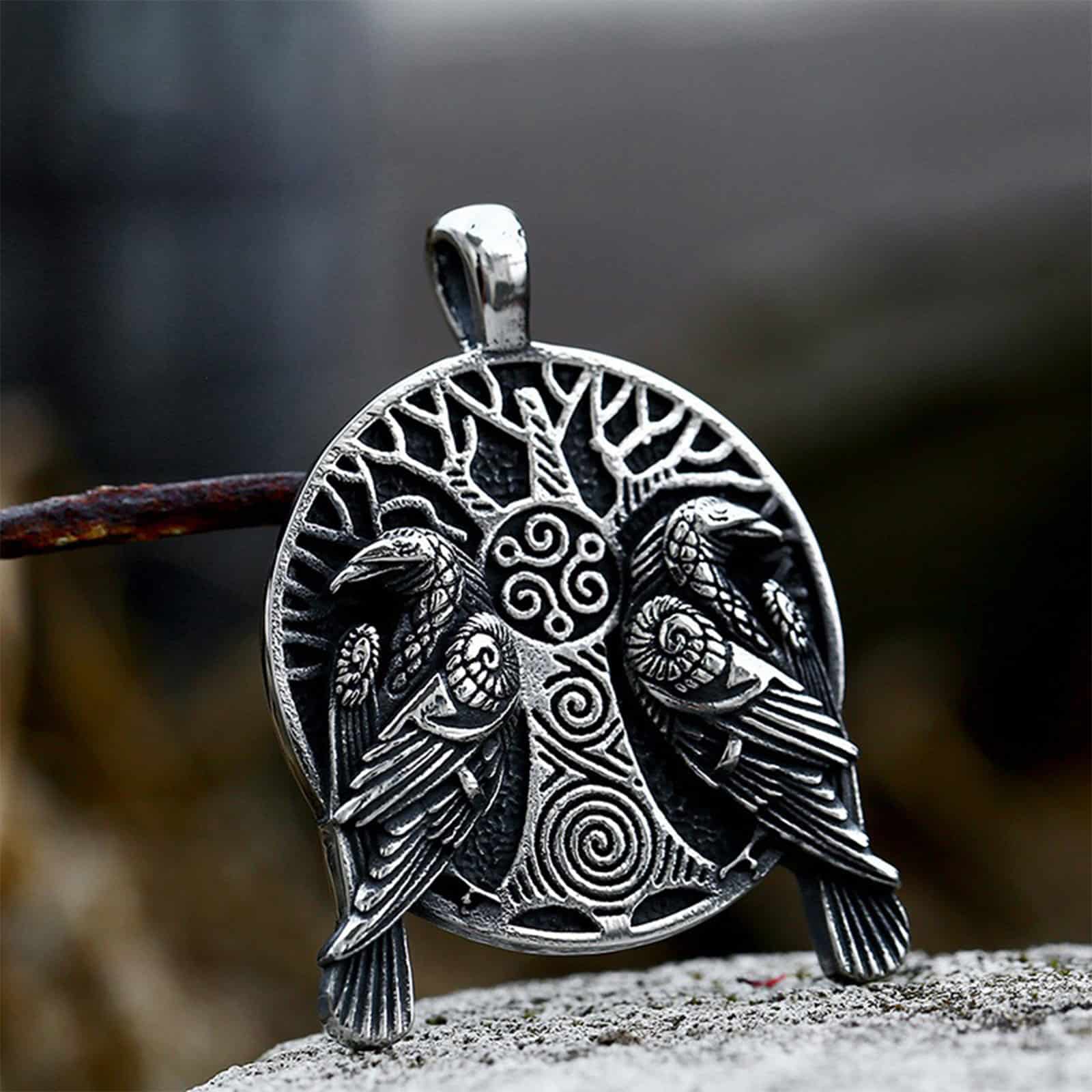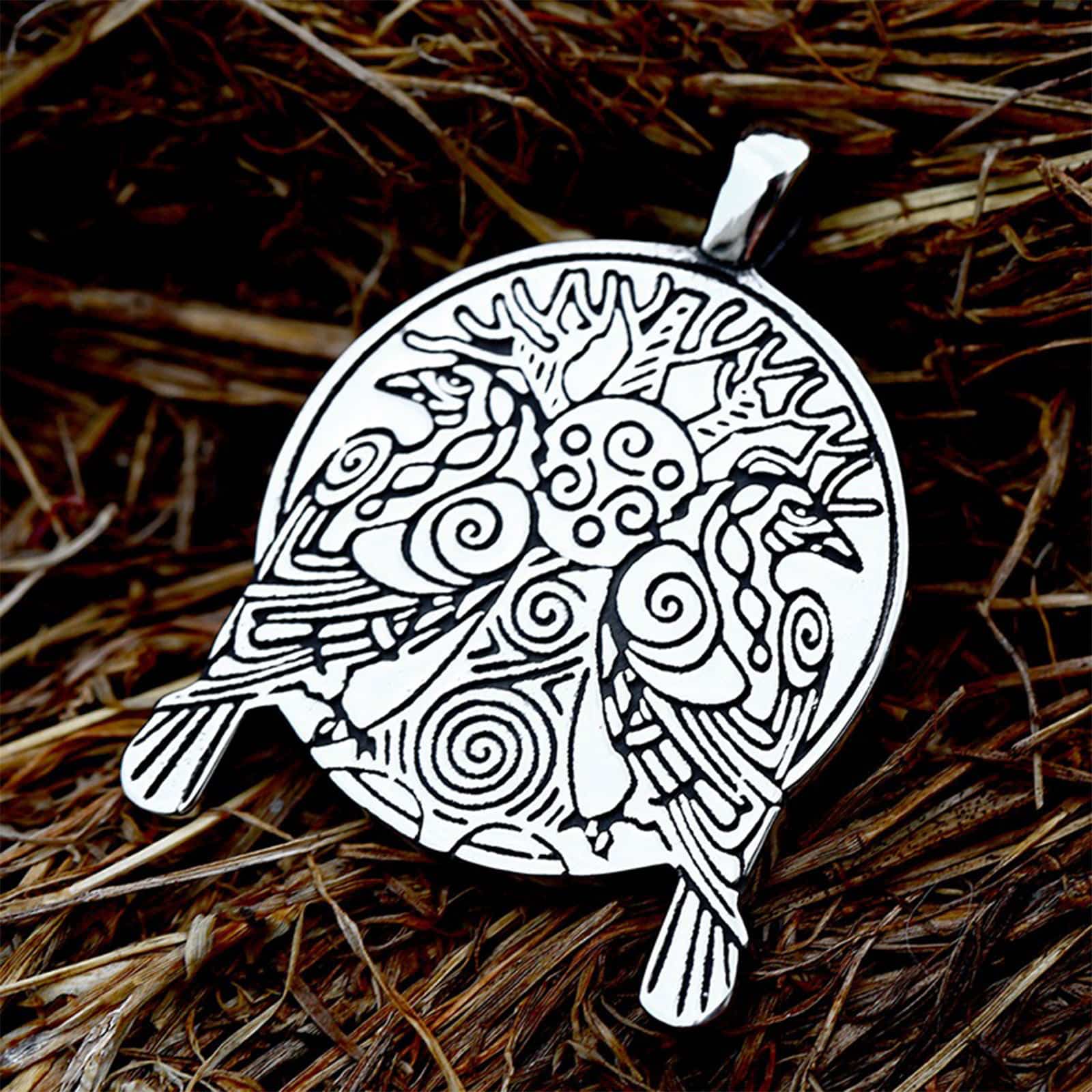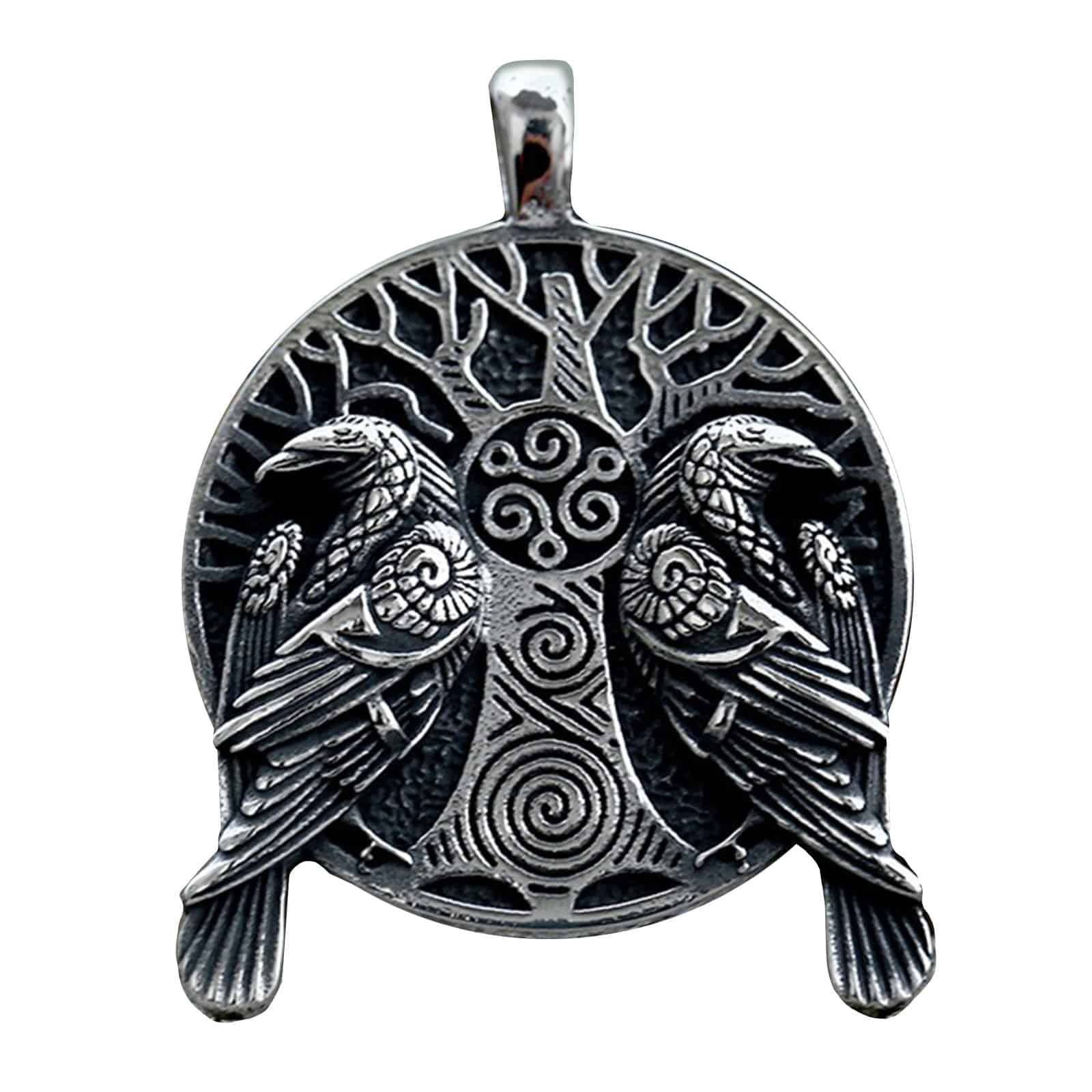 Detaillierter Anhänger eines Baumes mit zwei großen Vögeln davor aus rostfreiem Stahl inklusive Kette.