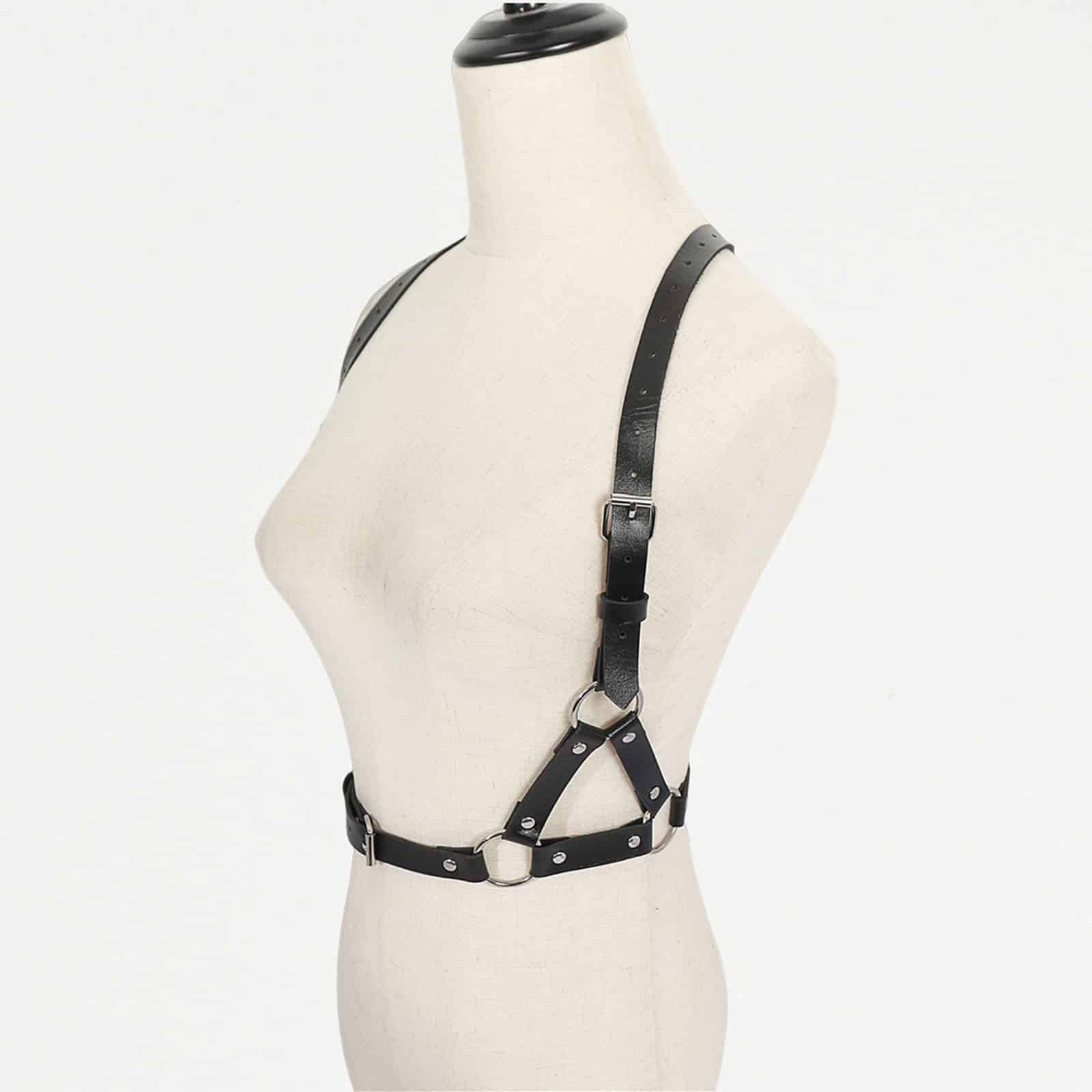 Klar, markant und kompromisslos – dieser Harness aus Kunstleder setzt auf geometrische Linien und metallische Akzente. Die markanten Dreieck-Elemente und O-Ringe verleihen deinem Look eine kraftvolle, industrielle Note. Perfekt als Layering-Piece über Kleidern, Shirts oder Bodys für einen starken Gothic-, Punk- oder Festival-Style.