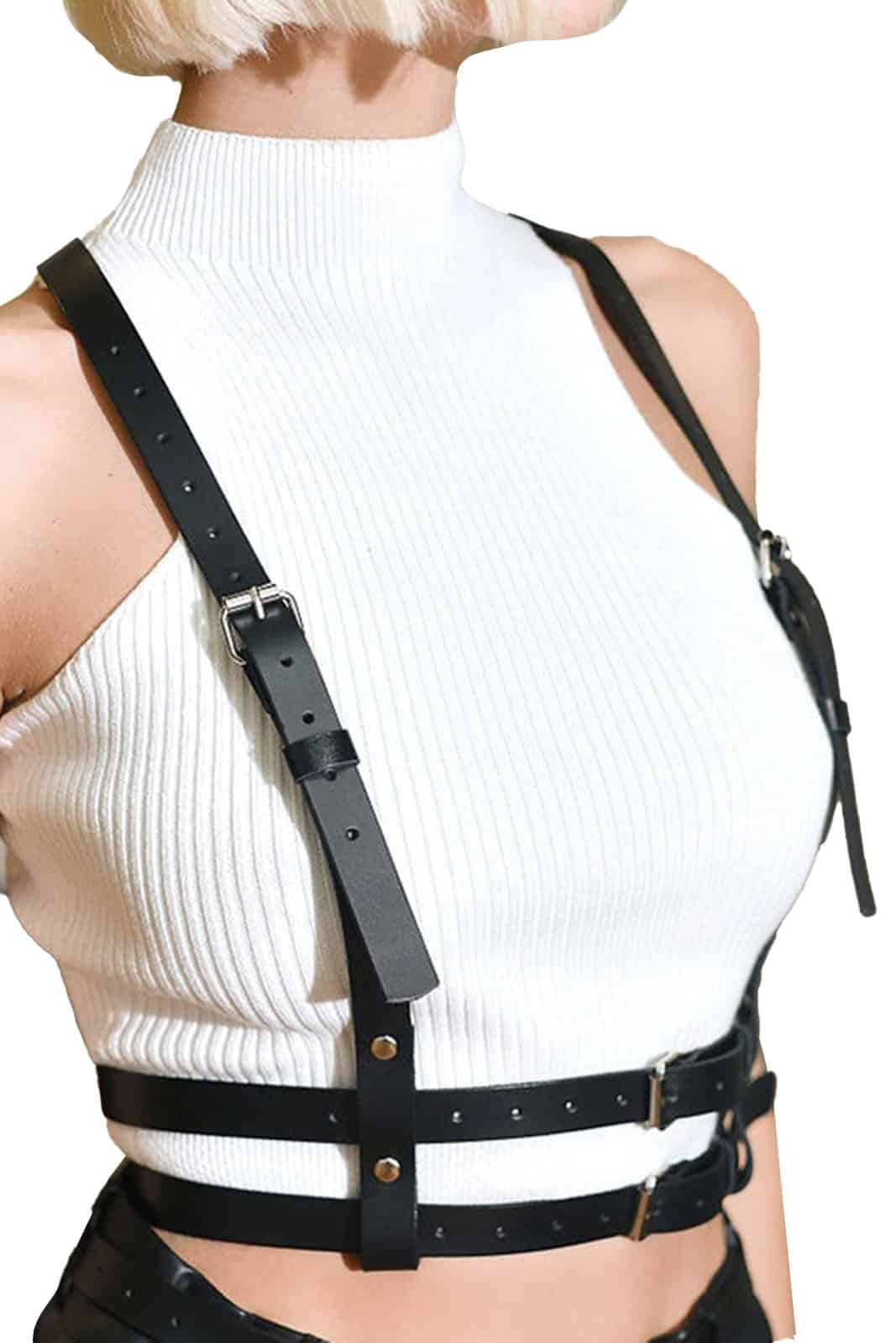 Reizvoller Harness mit verstellbaren Trägern und zweireihigem Gürtelband. Hergestellt aus hochwertigem, veganem Kunstleder. Alle Riemen sind einstellbar.