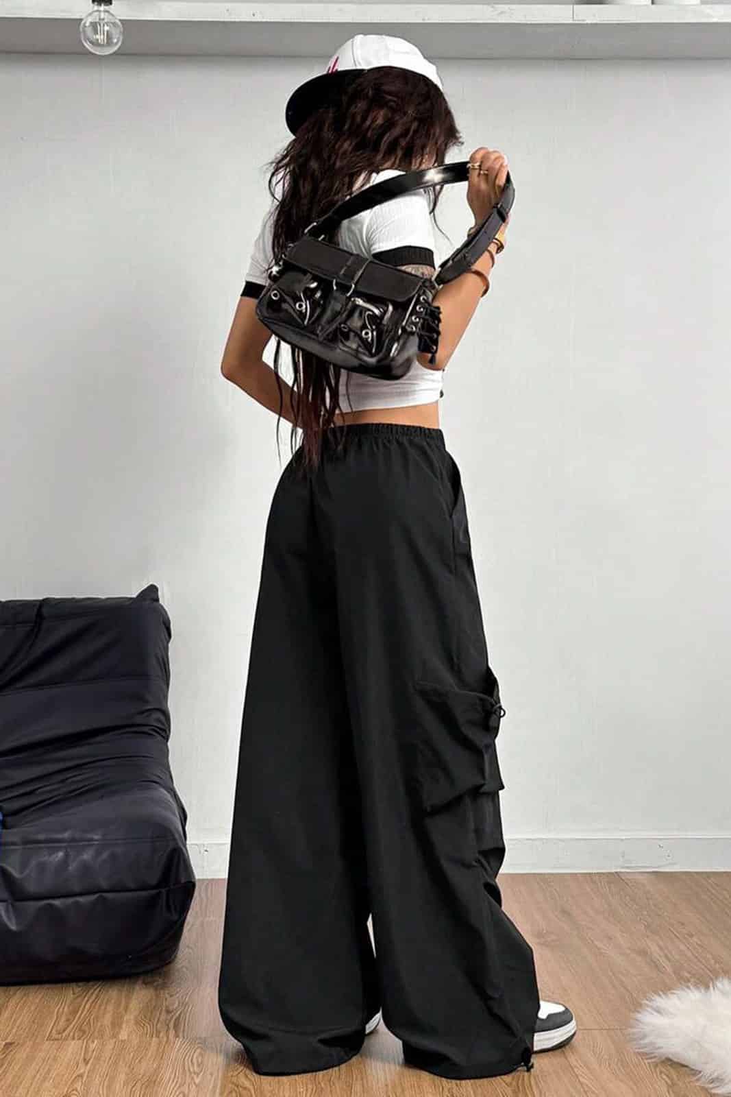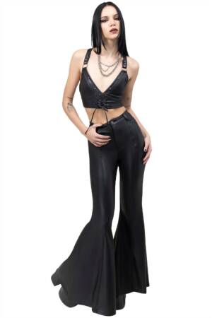 Diese auffällige Gothic-Hose kombiniert dramatische Schnürungen mit einer markanten Schlag-Silhouette. Seitliche Cut-outs mit breiter Schnürung setzen Beine und Figur perfekt in Szene, während der elastische Bund für angenehmen Tragekomfort sorgt. Ein Statement-Piece, das gleichermaßen für Clubnächte, Festivals oder alternative Streetwear geschaffen ist.