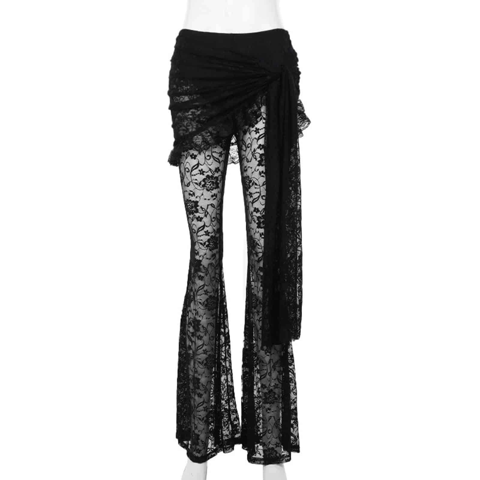 Diese außergewöhnliche Gothic-Hose vereint Transparenz, Verspieltheit und dunkle Eleganz. Der fließende Spitzenstoff mit Schlagbein sorgt für eine dramatische Silhouette, während das integrierte blickdichte Höschen Komfort und sicheren Halt bietet. Der obere Wickelteil ist abnehmbar und kann individuell gebunden werden – perfekt, um den Look immer wieder neu zu stylen. Dank elastischem Bund kommt die Hose ganz ohne Reißverschluss aus und bleibt dabei angenehm zu tragen.