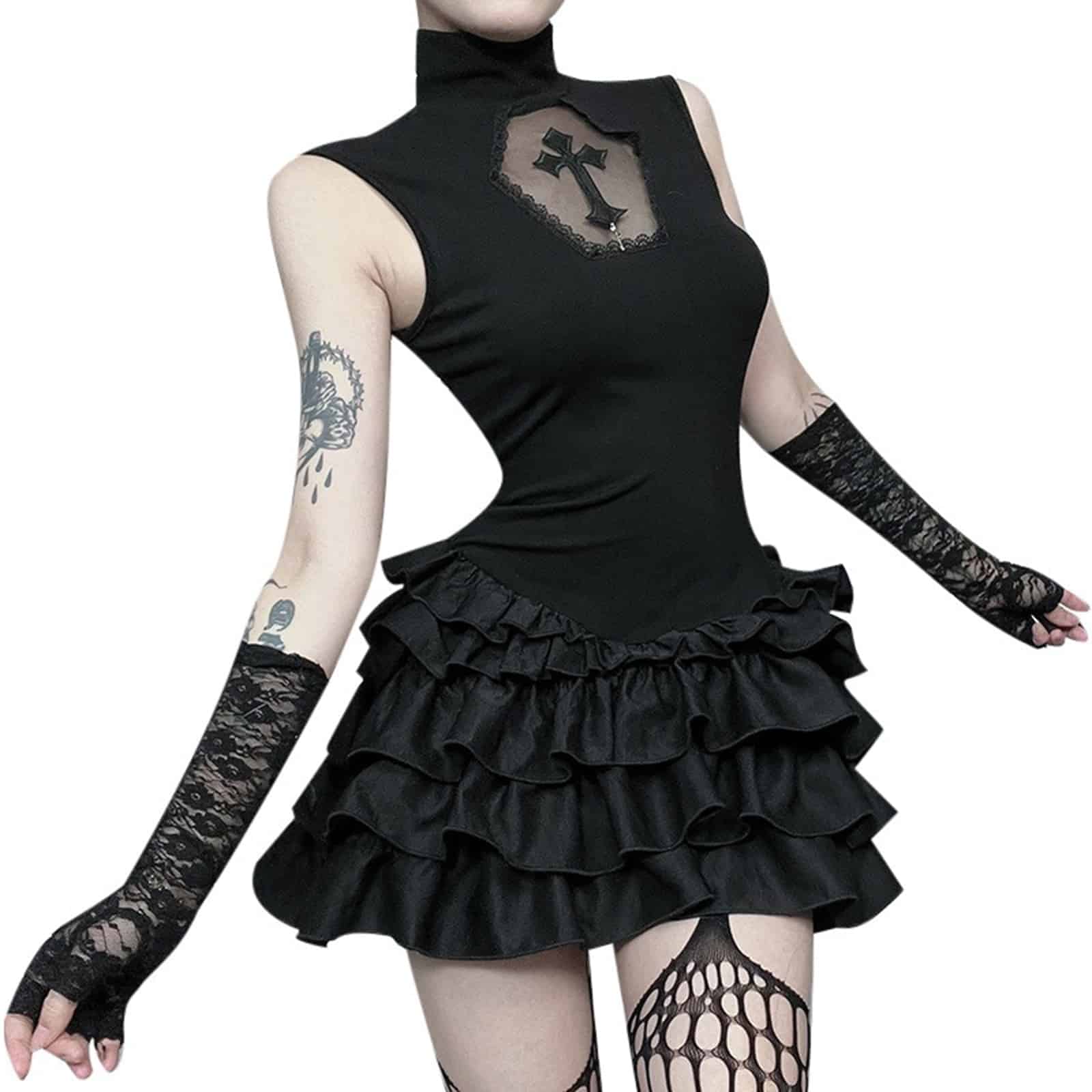 Dieses Kleid verbindet düstere Romantik mit einer frechen Verspieltheit. Der körpernahe, ärmellose Oberteil-Teil wird durch ein eingesetztes Mesh-Detail mit Kreuz-Applikation im Dekollete-Bereich ergänzt, was dem Look eine geheimnisvolle Note verleiht. Der Stehkragen betont die elegante Silhouette zusätzlich. Der Rockteil besteht aus mehreren lagenweise angeordneten Rüschen, die dem Modell Volumen und eine verspielte Bewegung verleihen. Das Zusammenspiel aus schlichter Form und dramatischer Textur macht dieses Design zu einem ausdrucksstarken Statement für alle, die einen dunklen, aber femininen Stil lieben.