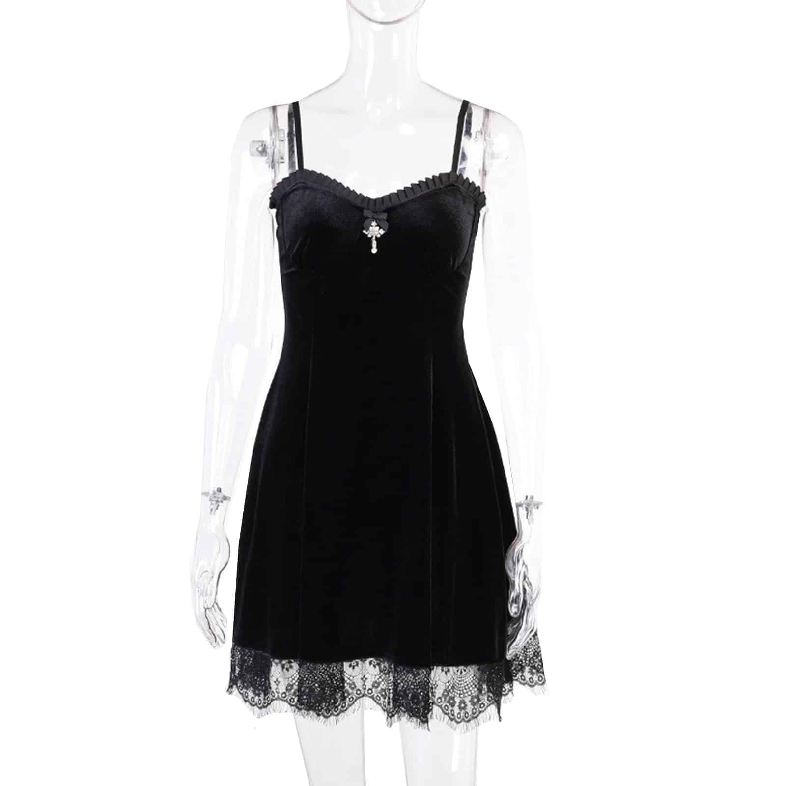 Weich fallendes Samt-Kleid mit dünnen Trägern und Spitzenabschluss am Saum. Der Ausschnitt ist mit einer kleinen Schleife und einem Kreuz-Anhänger verziert. Ärmellos.