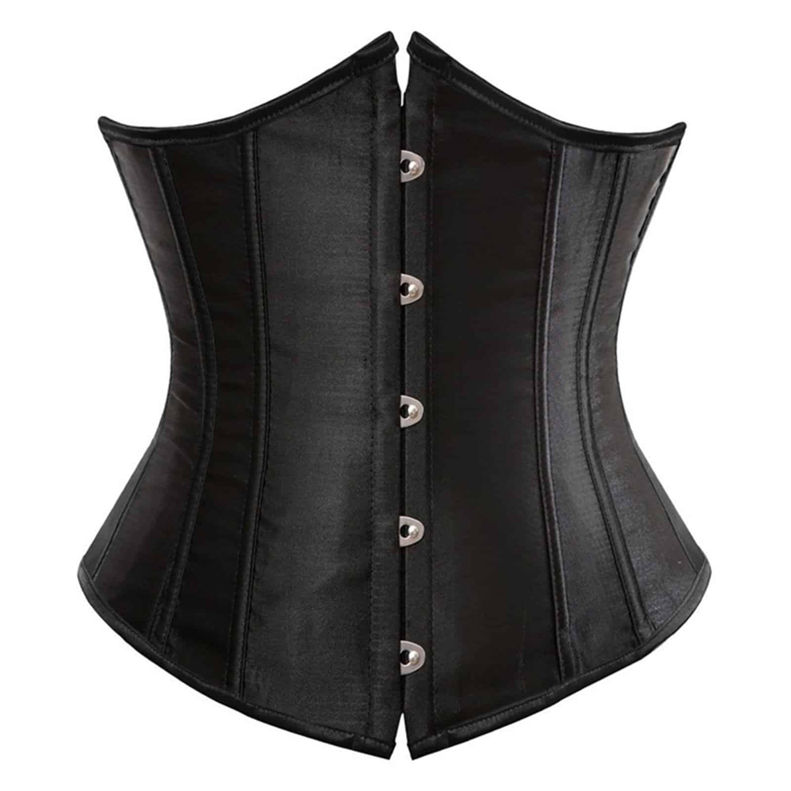 Leichtes Unterbrustkorsett aus glänzendem Satintstoff. Ausgestattet mit Kunststoffstäbchen und Rückenschnürung aus Satin, geführt durch silberne Ösen. Die Front ist mit einem fünffachen Häkchenverschluß ausgestattet.