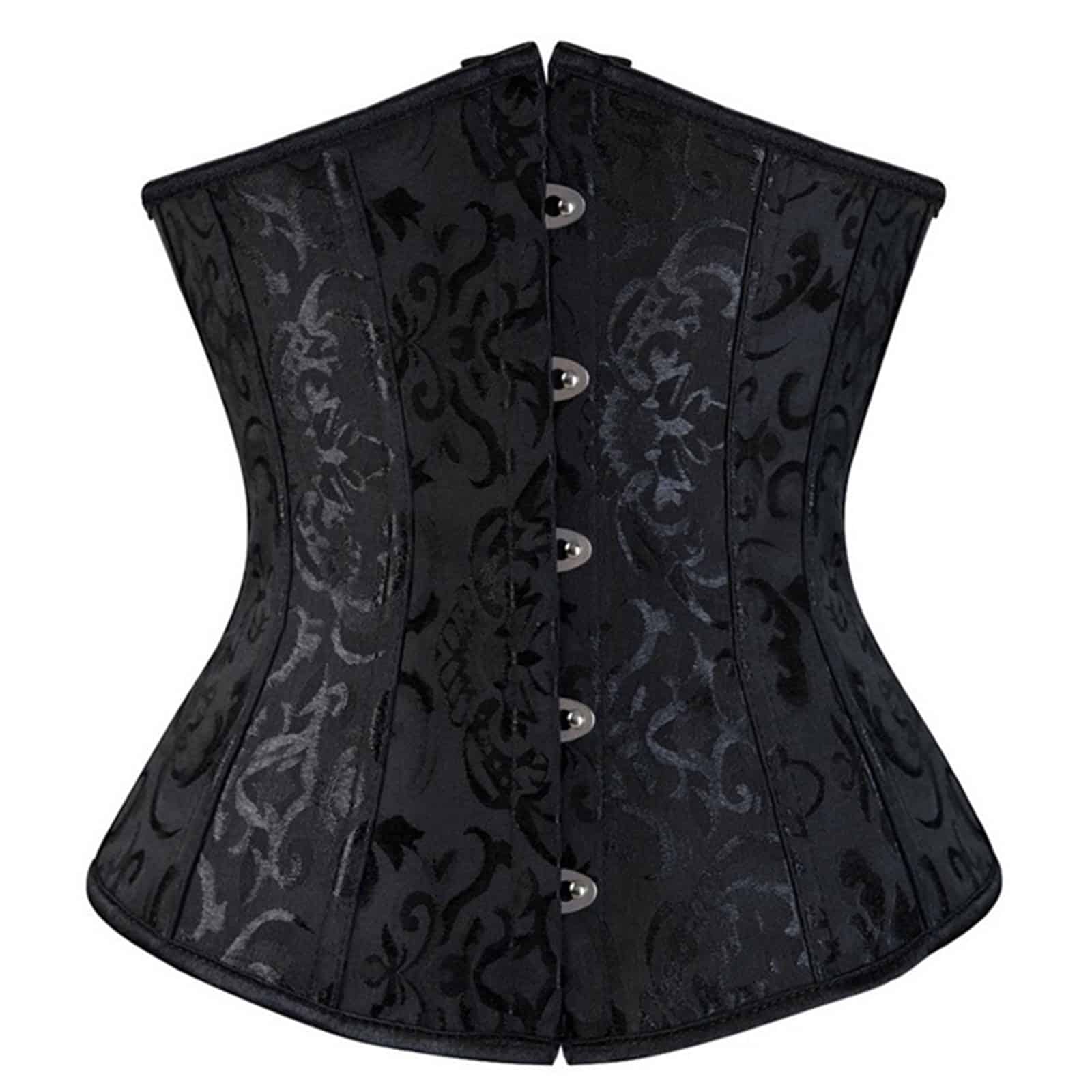 Leichtes Unterbrustkorsett aus leicht glänzendem Brokatstoff. Ausgestattet mit Kunststoffstäbchen und Rückenschnürung aus Satin, geführt durch silberne Ösen. Die Front ist mit einem fünffachen Häkchenverschluß ausgestattet.