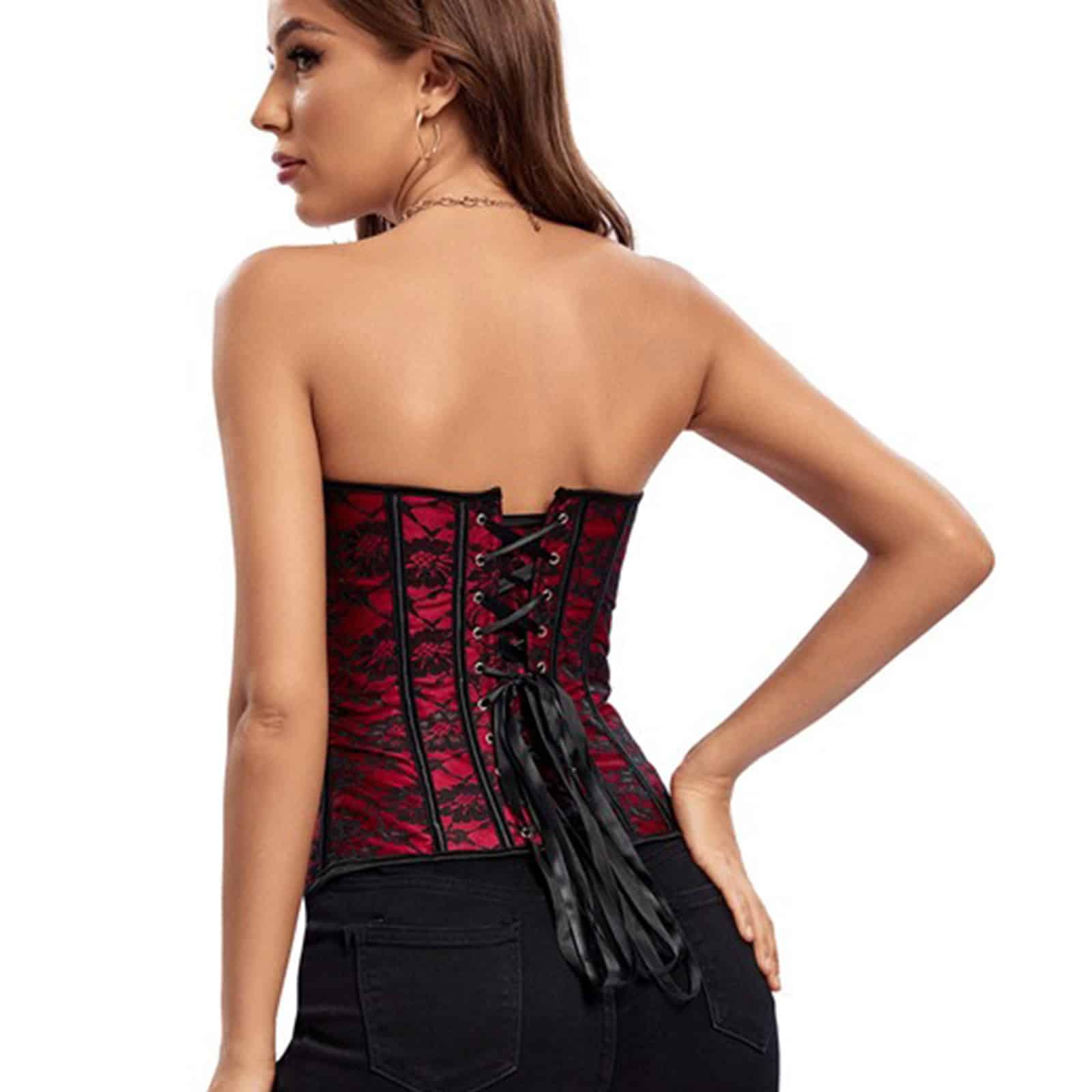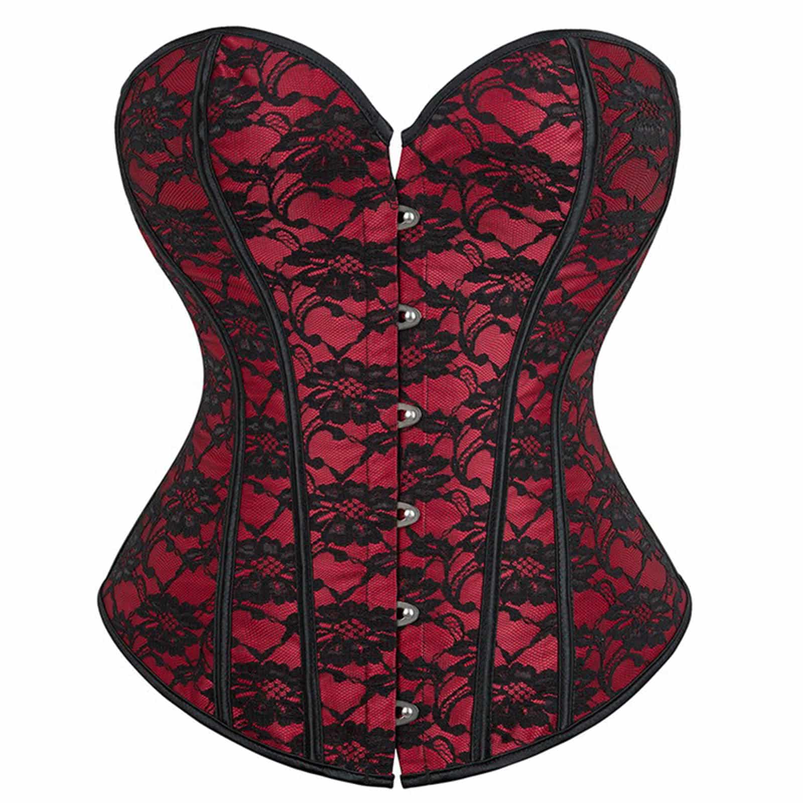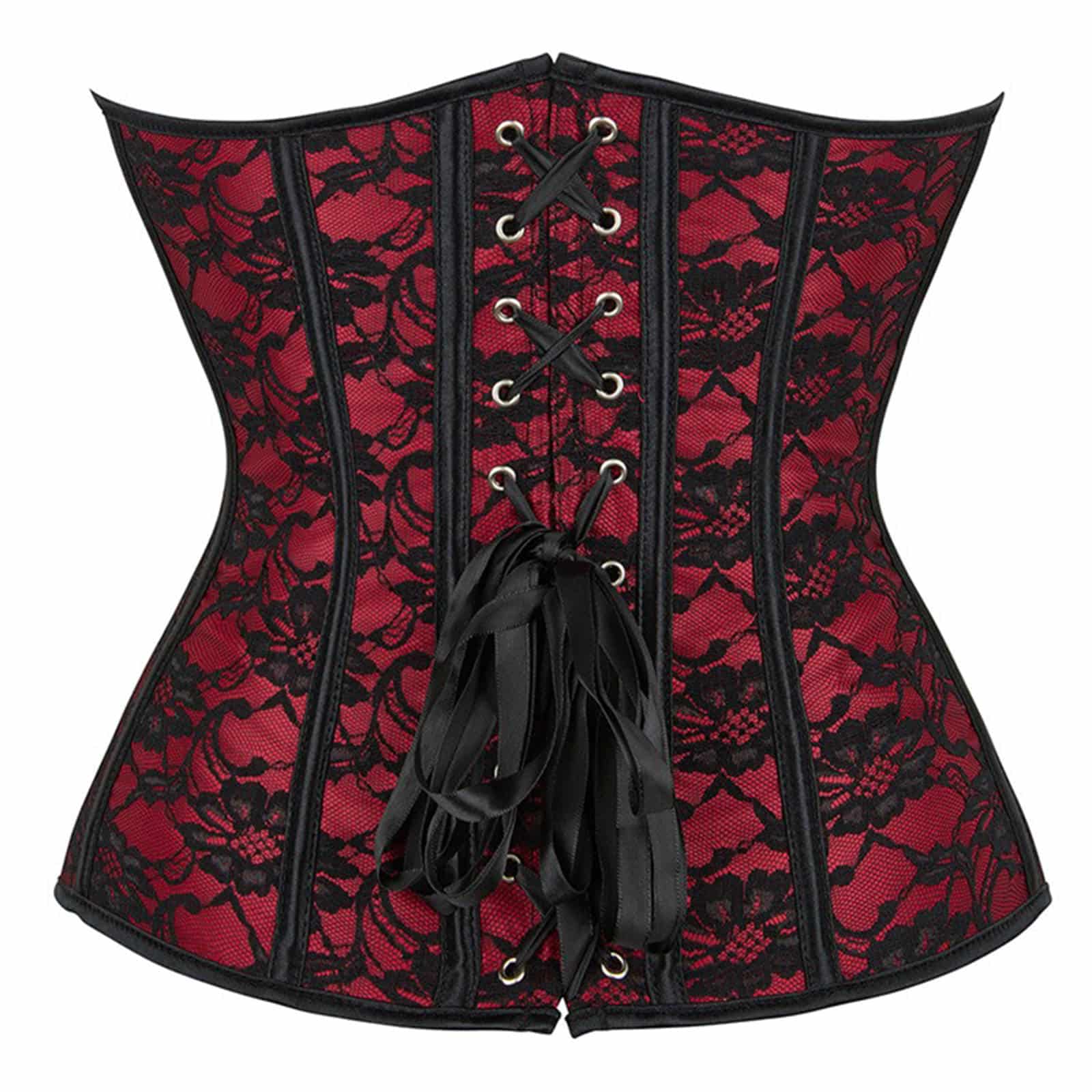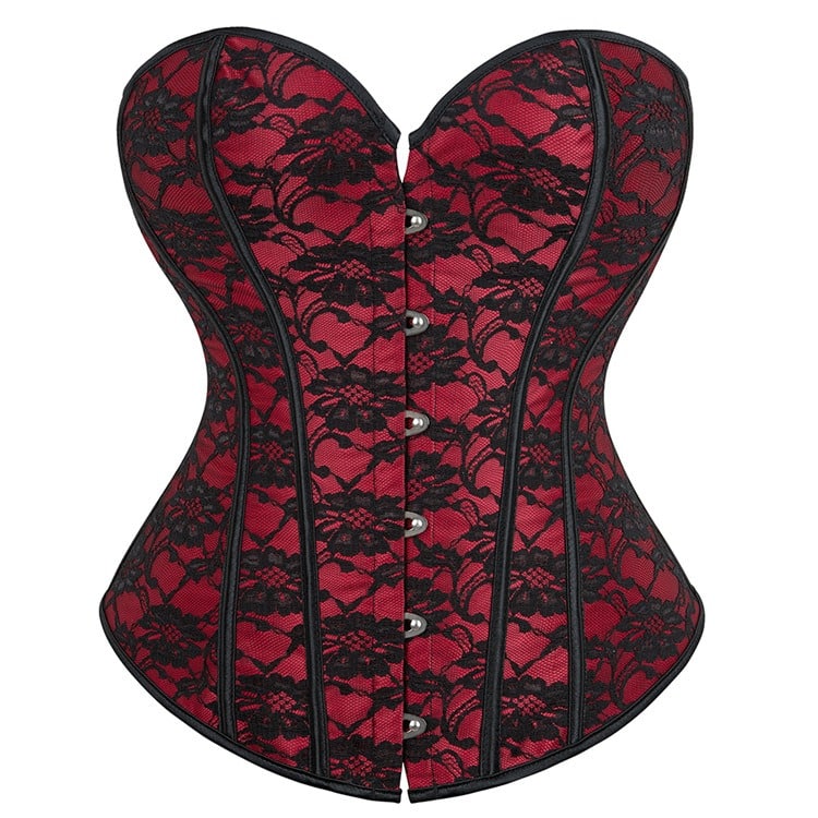 Klassisches Überbrustkorsett mit Kunststoffstäbchen, Rückenschnürung und Häkchenverschluß. Das leicht glänzende Brokatmaterial mit Blumenmuster trägt sich angenehm und zieht die Blicke auf sich. Vielfältig kombinierbar.