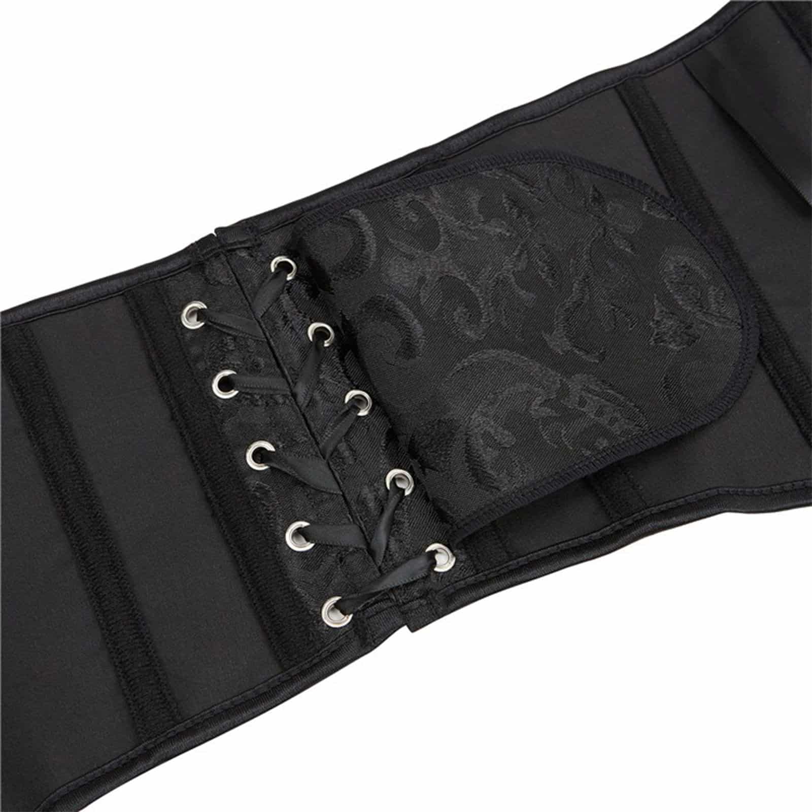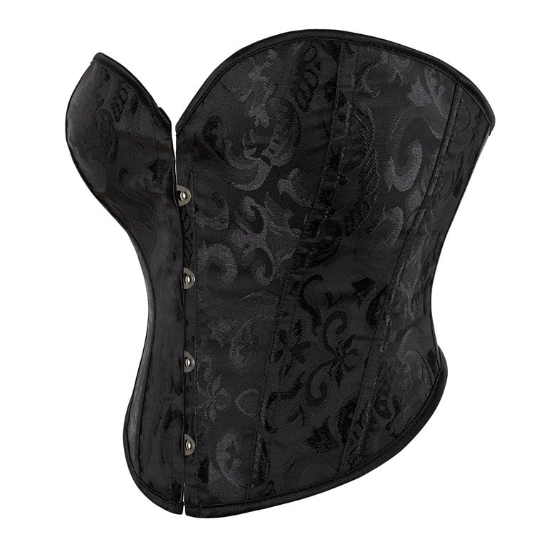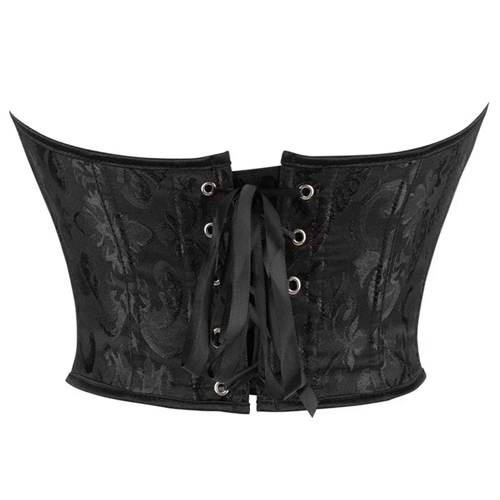 Kurz geschnittenes Überbrustkorsett mit Kunststoffstäbchen und Rückenschnürung. Die Front ist mit einen Häkchenverschluß ausgestattet. Die Rückenschnürung ist mit einer Lasche gefüttert. Ein schönes Brokatmuster ziert das gesamte Material.