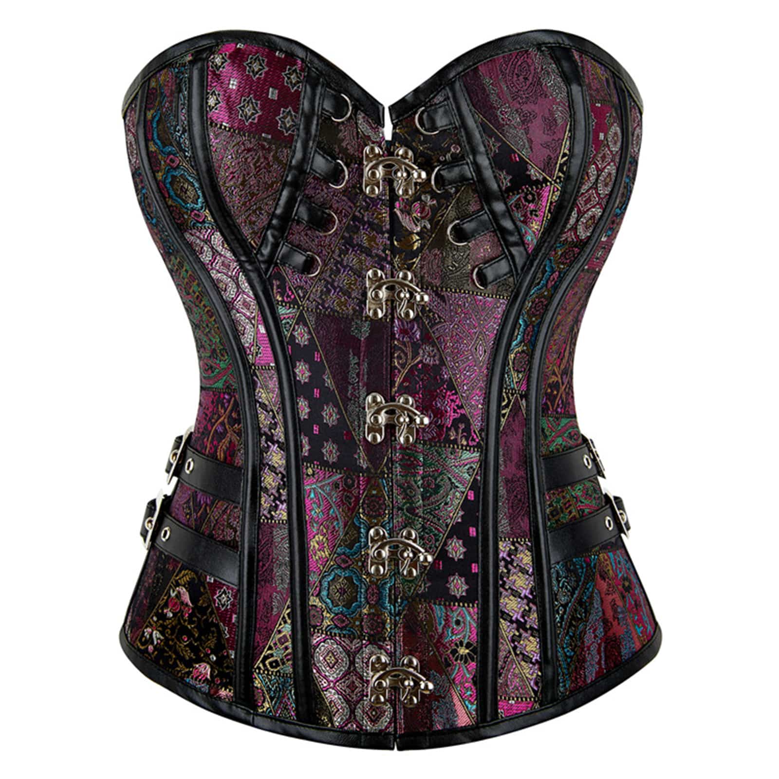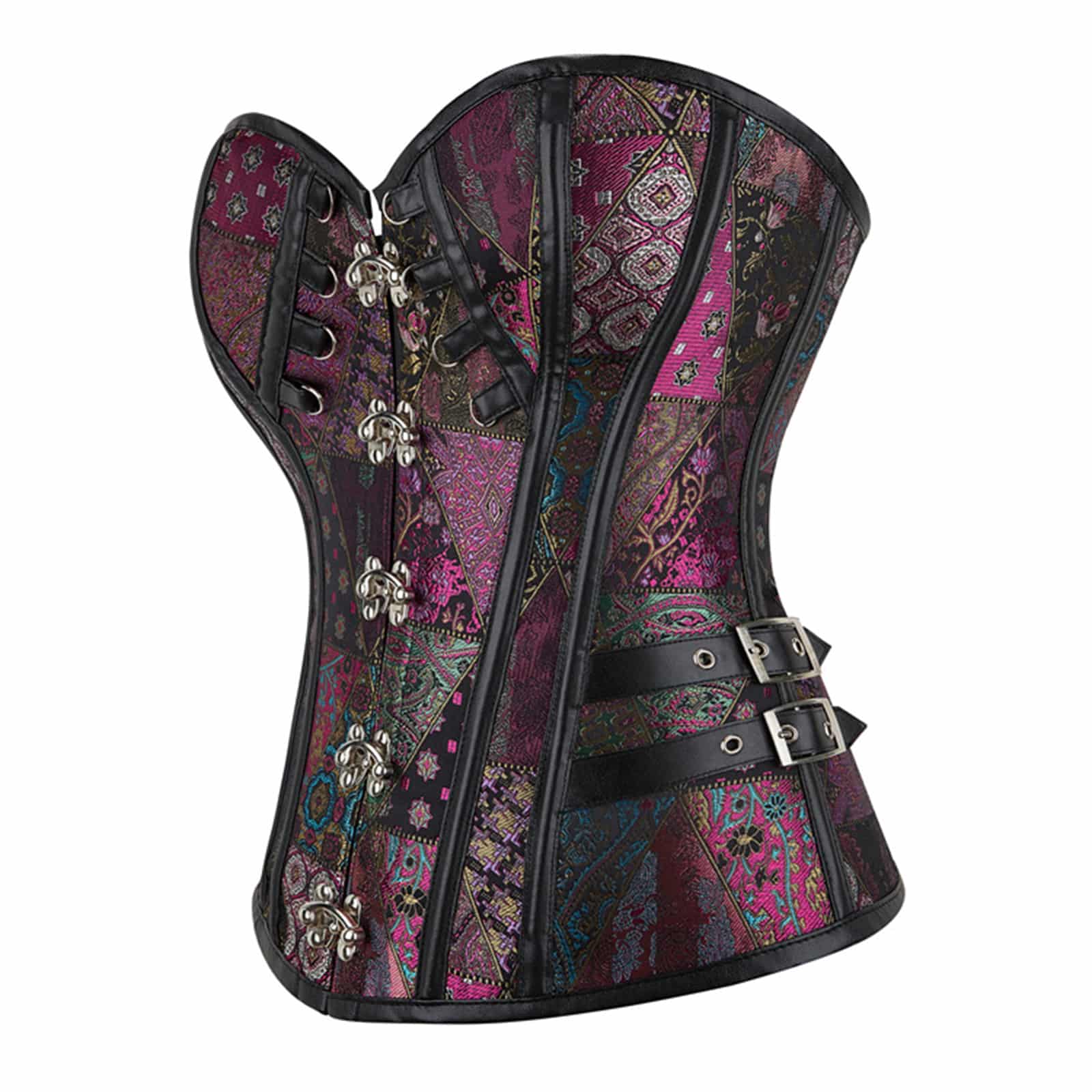 Ein ausdrucksstarkes Korsett im opulenten Patchwork-Design, das viktorianische Eleganz mit moderner Alternative-Ästhetik verbindet. Schimmernde Ornamente in tiefen Rot-, Violett- und Grüntönen machen dieses Modell zu einem echten Statement-Piece – perfekt für Gothic, Steampunk oder extravagante Festival-Looks. Die formgebenden Stäbchen sorgen für eine feminine Silhouette, während Schnürung und seitliche Riemen eine individuelle Anpassung ermöglichen.