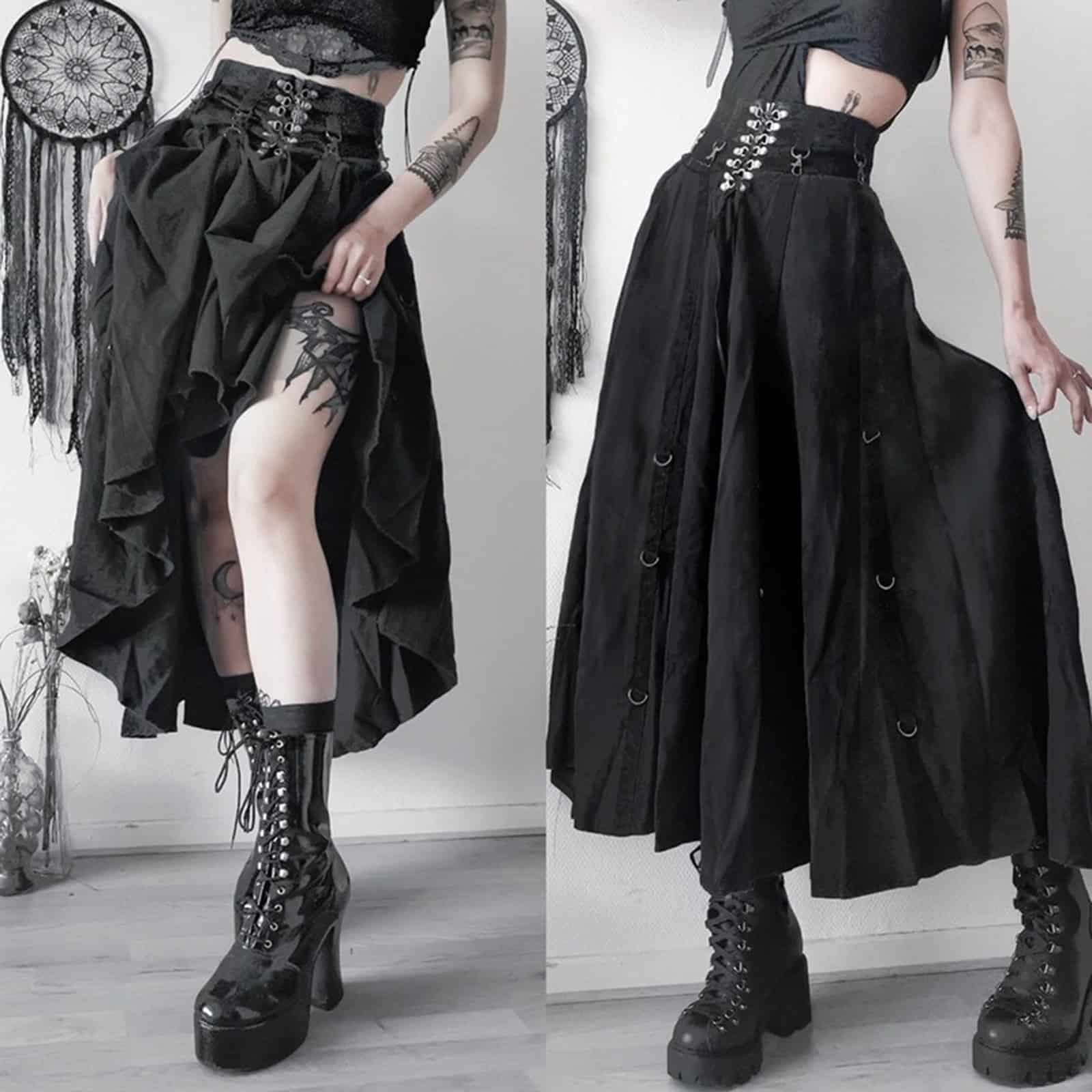 Bodenlanger Gothic-Rock mit festem Bund und Reißverschluß im Rücken.