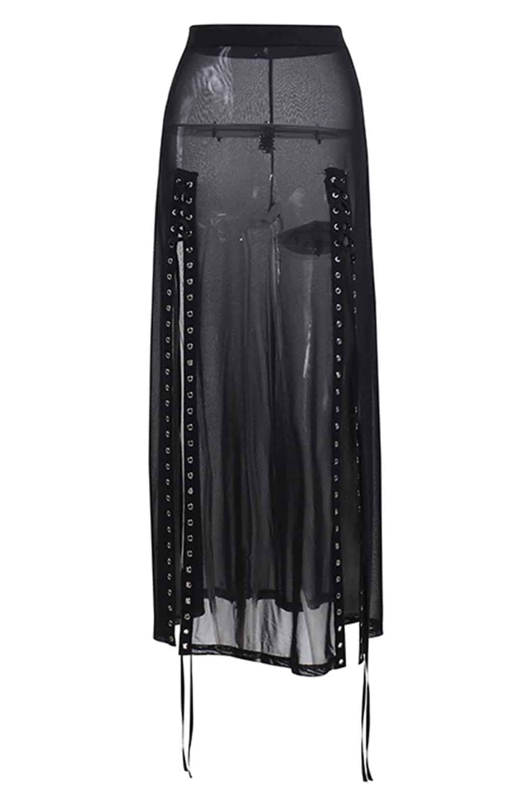 Transparenter Rock mit elastischem Gummizug. Zwei seitliche Gehschlitze sind durchgehend mit Ösen besetzt. Ein beiliegende Schnürung kann variabel angelegt werden um die Schlitze zu verengen. Ohne blickdichten Einsatz.