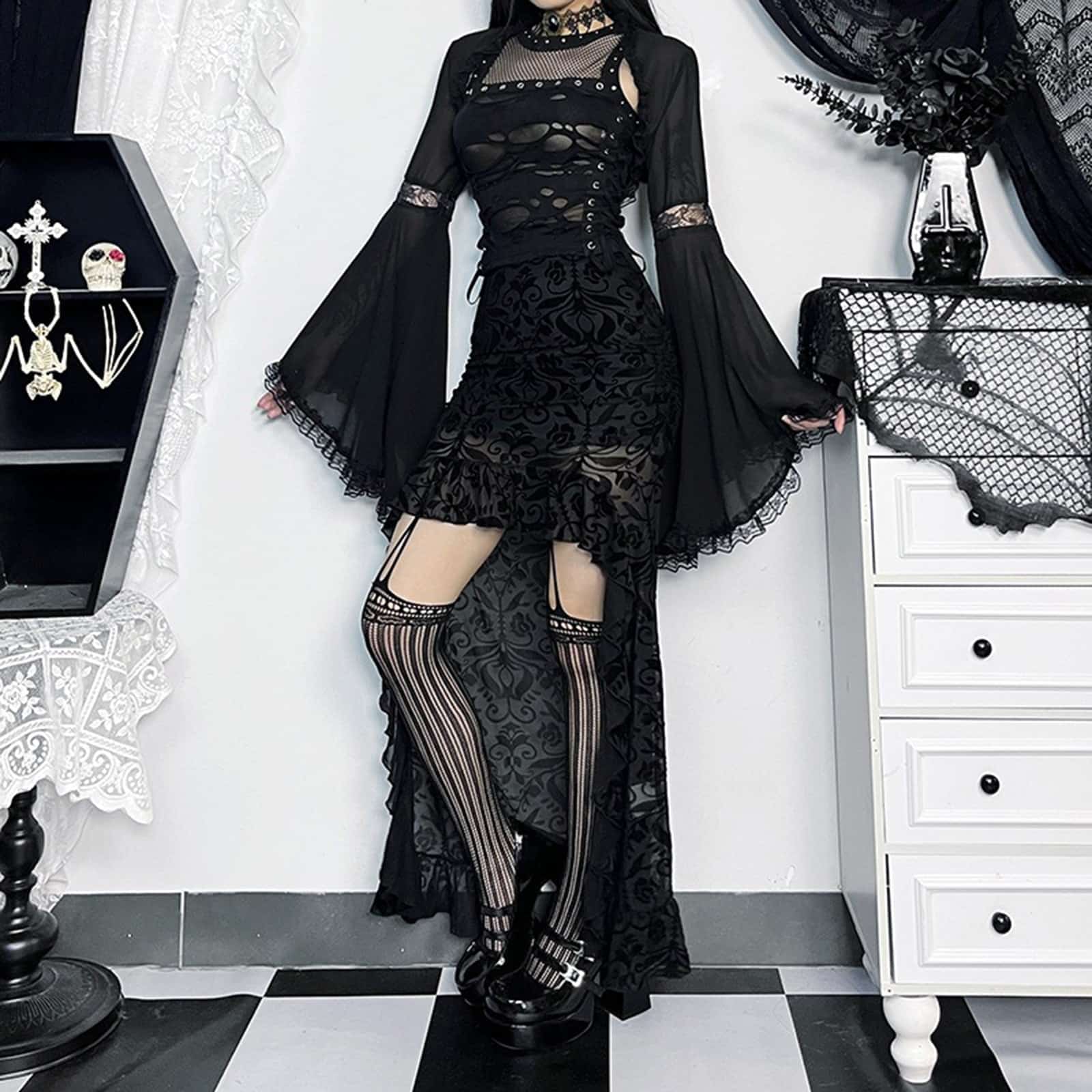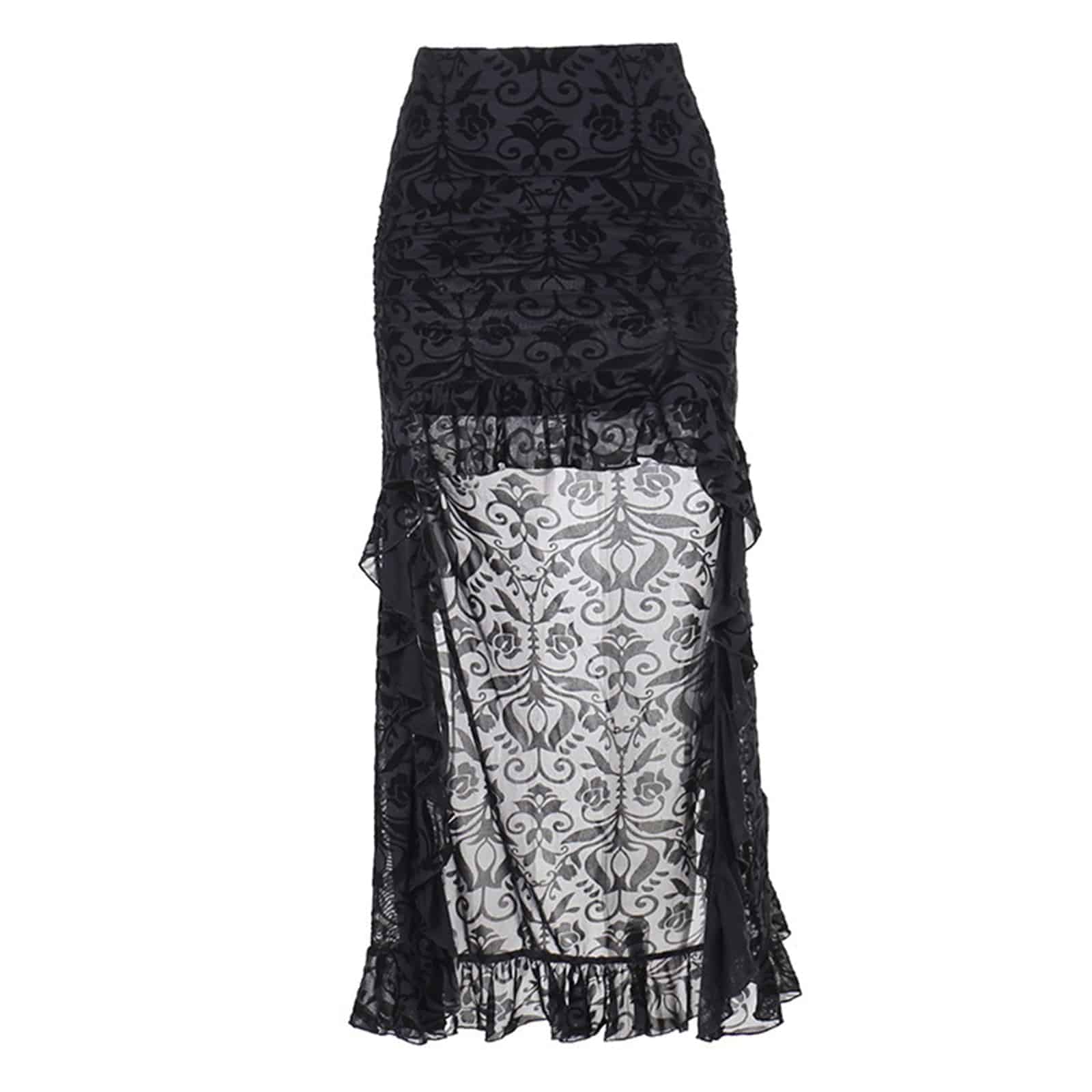 Bodenlanger Gothic-Rock mit kurzer Front aus leicht transparentem Stoff. Um die Hüfte ist ein blickdichter Unterrock eingenäht.