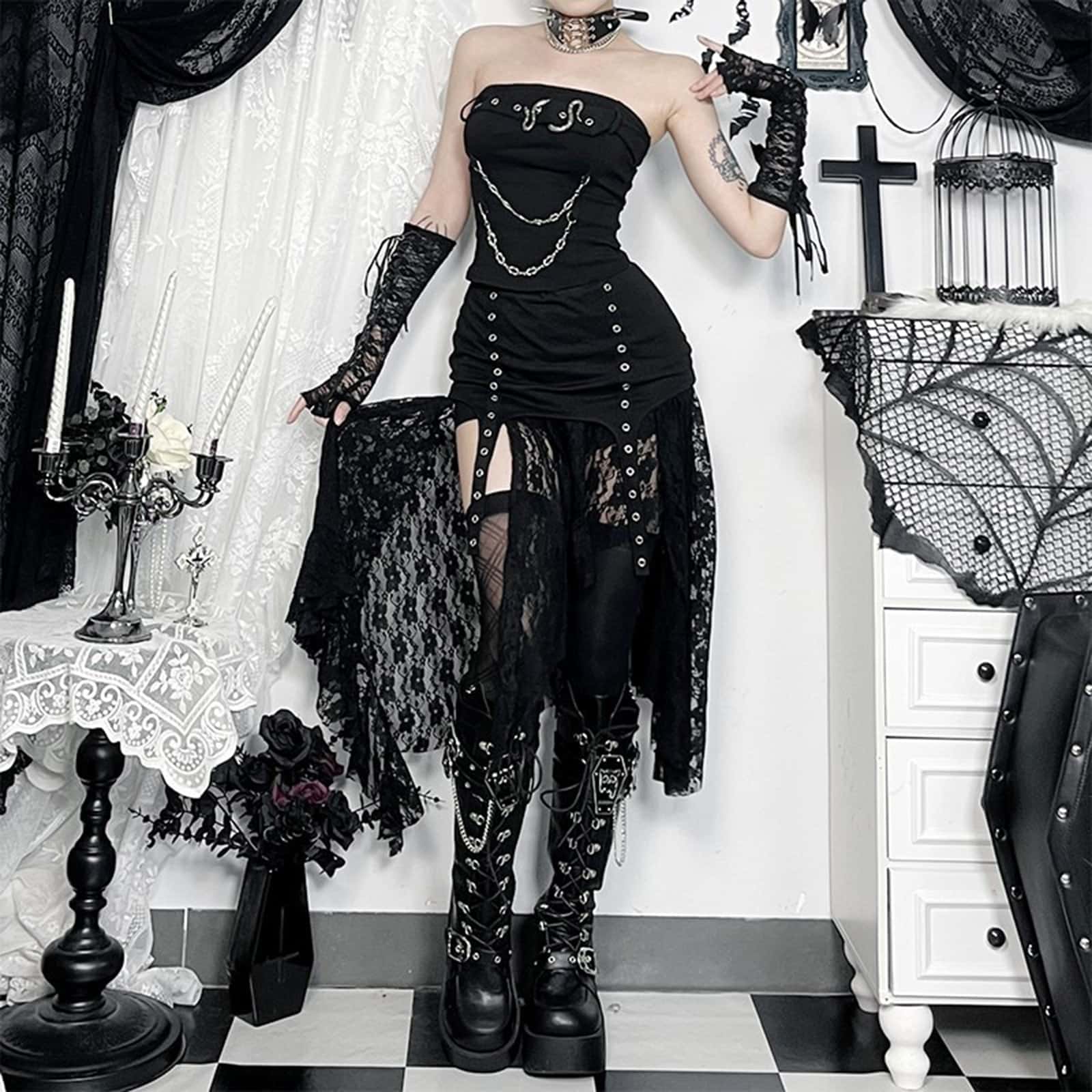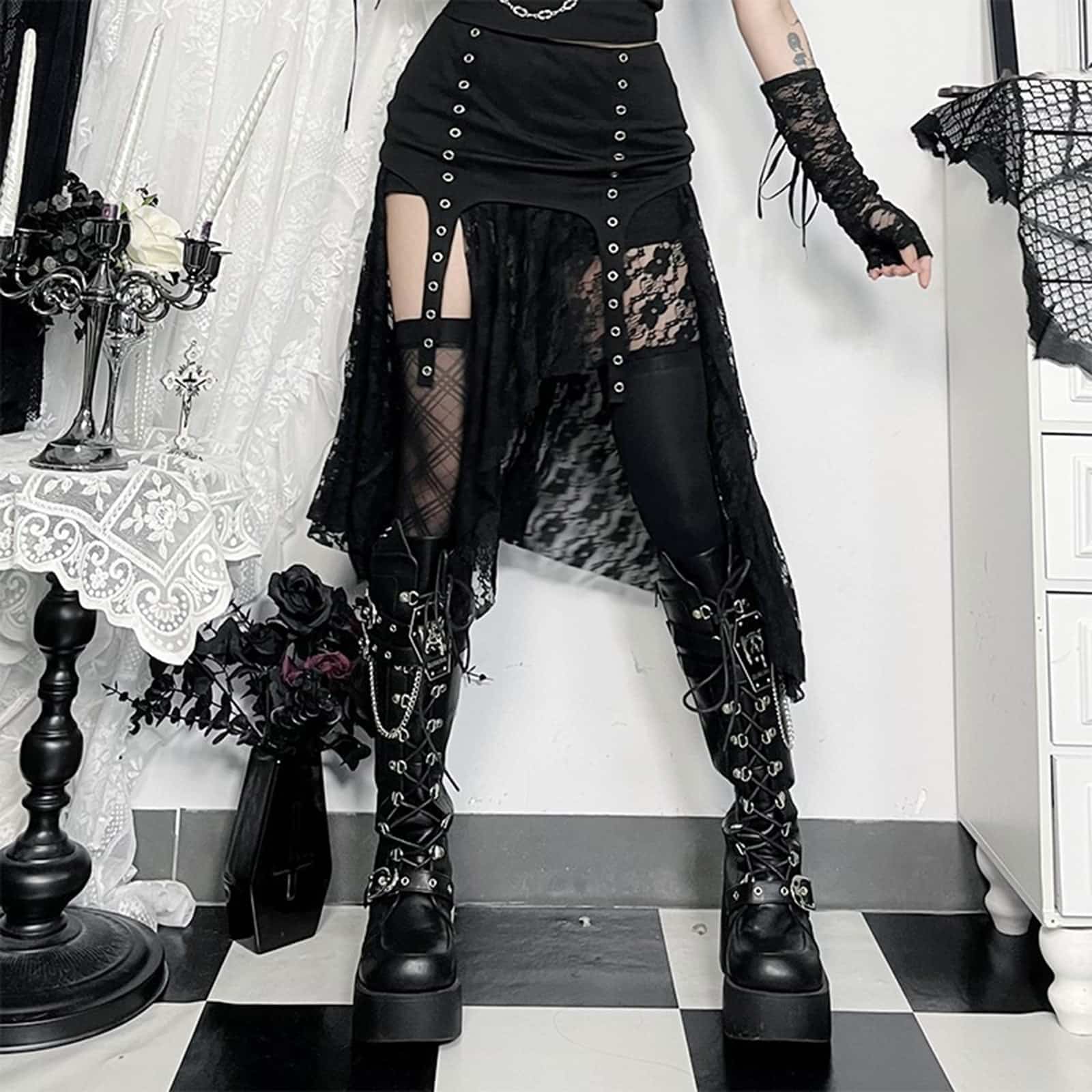 Mit Elementen wie Ketten, Schnallen und der halbtransparenten Spitze verkörpert dieser Rock den modernen Gothic-Stil in seiner raffiniertesten Form – perfekt für alle, die ihre dunkle Seite mit Stolz zeigen. Ideal kombinierbar mit Plateaustiefeln, Corsagen oder Spitzenhandschuhen.