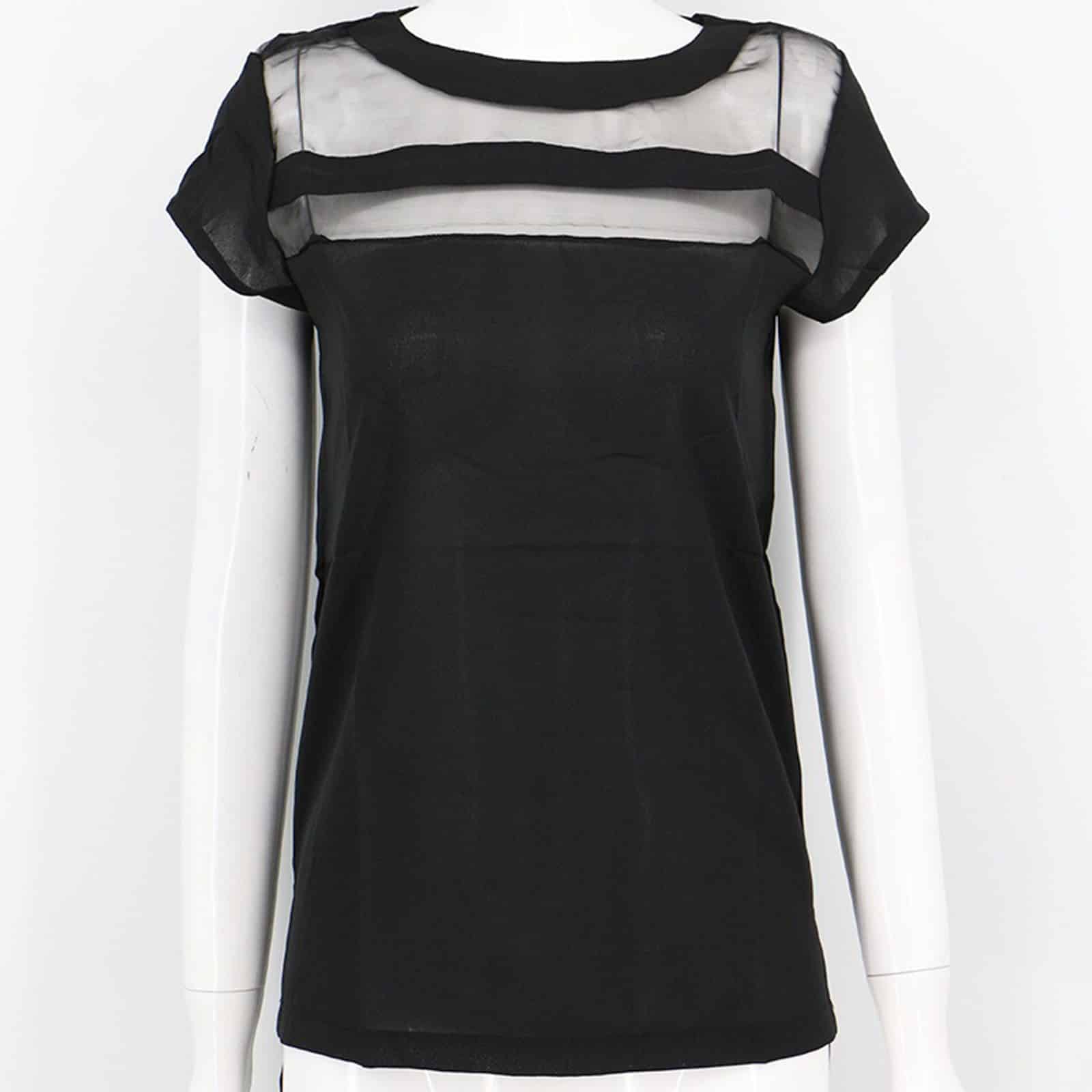 Leichtes Damenshirt mit Rundhalsausschnitt und Reißverschluß im Nacken. Die Vorderseite ist mit transparenten Netzeinsätzen ausgestattet.