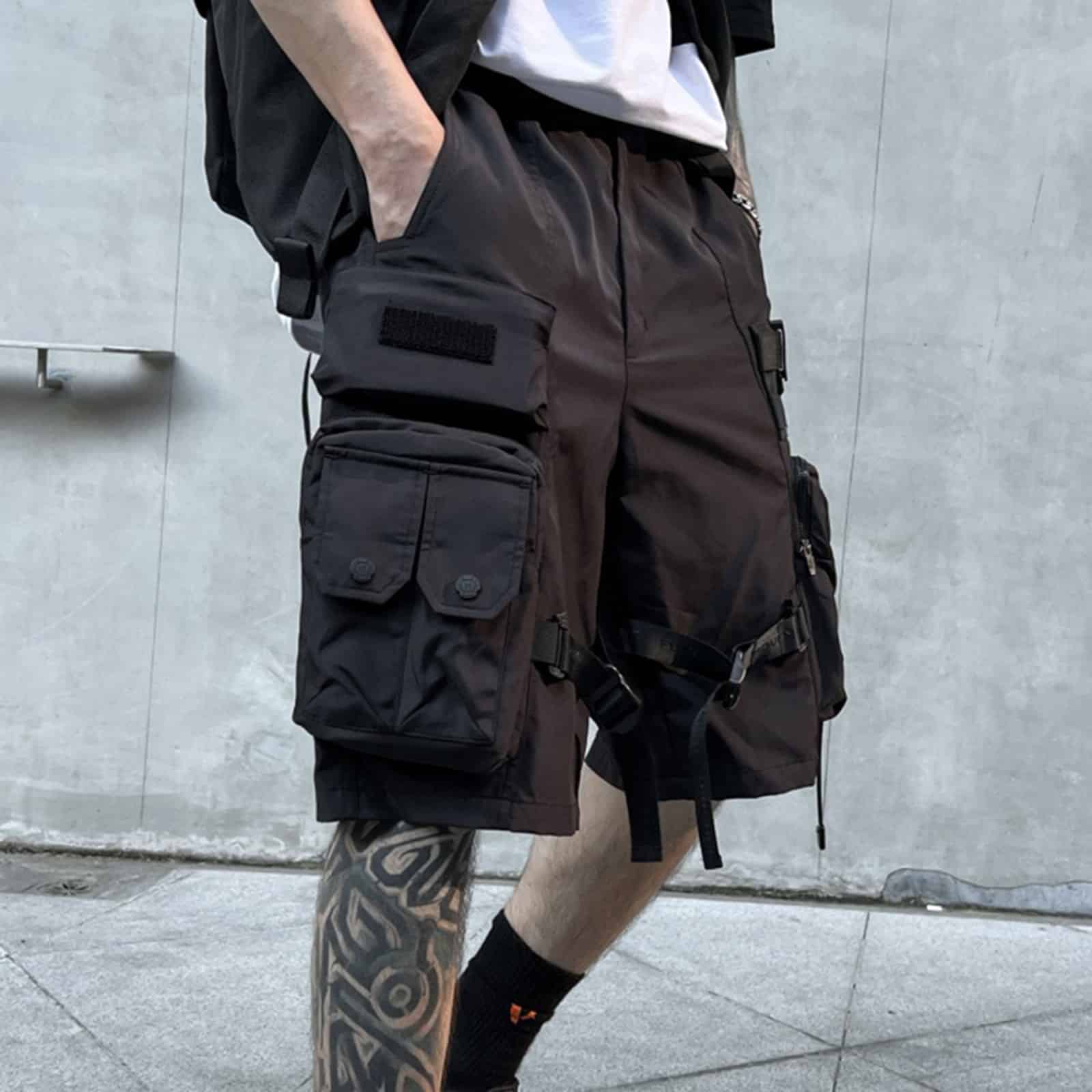 Leichte, lässige Herrenshorts mit zwei seitlichen Einschubtaschen. Die Gesäßtaschen sind mit praktischen Durckknöpfen versehen. Auf den Beinen sind Taschen mit Reißverschluß aufgesetzt. Zusätzlich sind zwei kleine Taschen, teils mit Druckknöpfen verarbeitet. Die Hose wird mit einem Reißverschluß und Druckknopf verschlossen. Der Bund ist mit einem Gummizug ausgestattet. Zusätzlich ist ein verstellbarer Gürtel eingearbeitet.