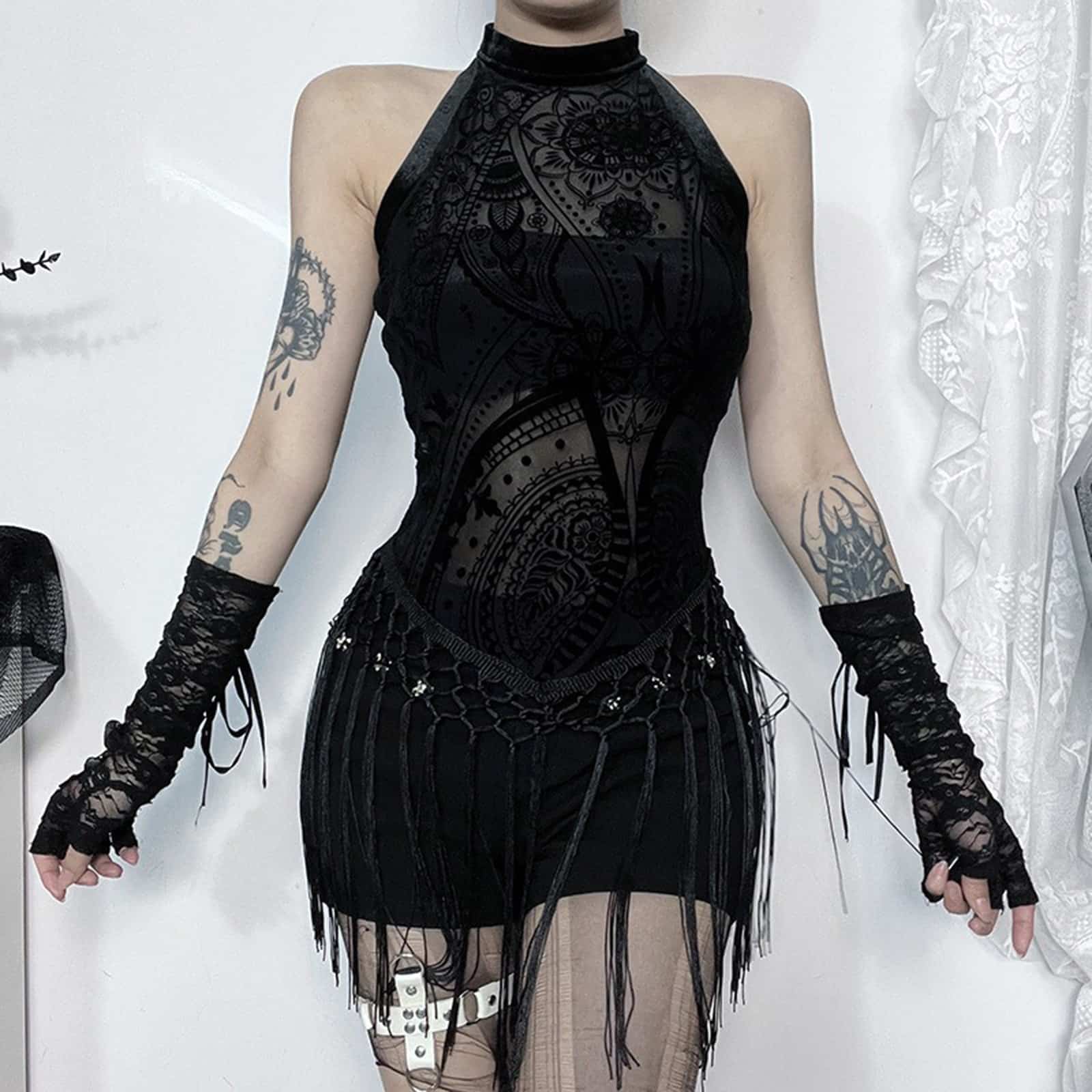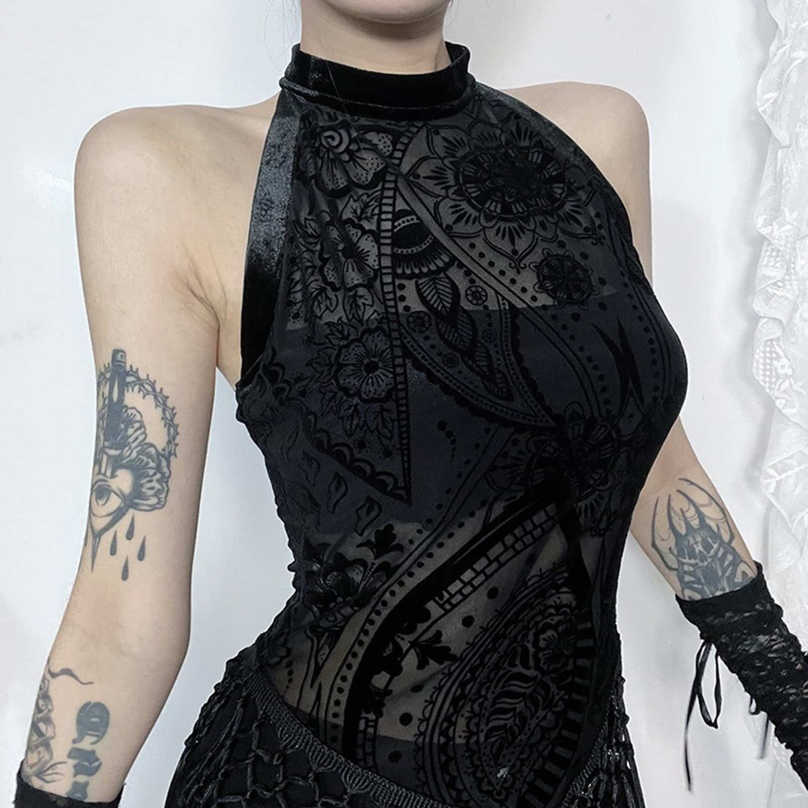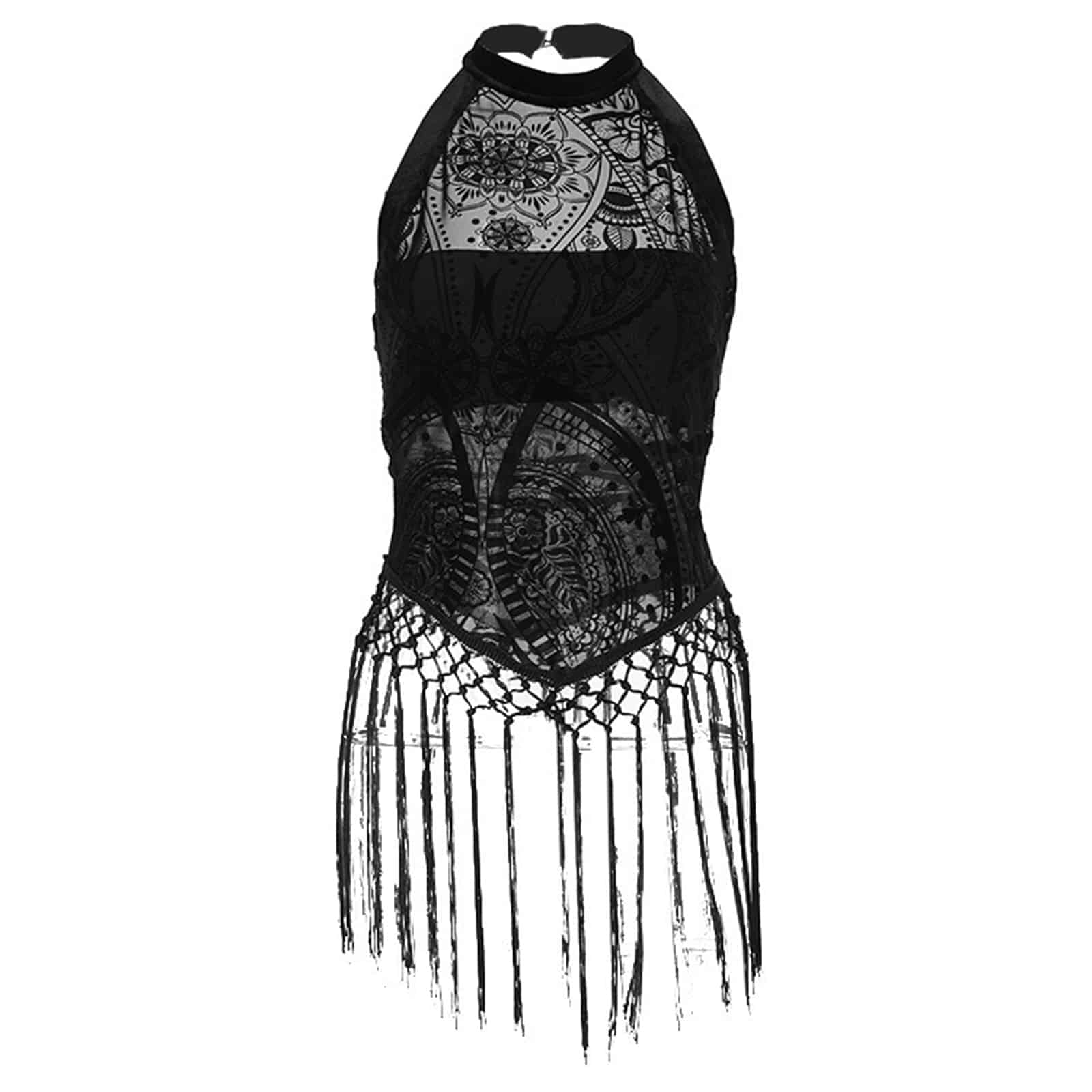 Ärmelloses Gothic-Top mit tailliertem Schnitt und Knopfverschluß am hohen Nacken. Der leicht transparente Stoff ist floral beflockt und mit einem hübschen Fransensaum bestückt.