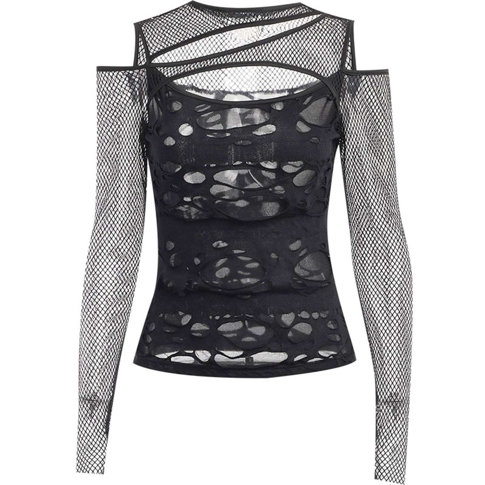 Longsleeve aus einem Körper im Distressed-Look mit asymmetrischem Halsausschnitt aus Netzstoff. Die Schultern sind frei und die Ärmel aus elastischem Netzmaterial gefertigt. Die Cut-Outs auf Vorder- und Rückseite sind mit transpartentem Mesh-Gewebe unterlegt.