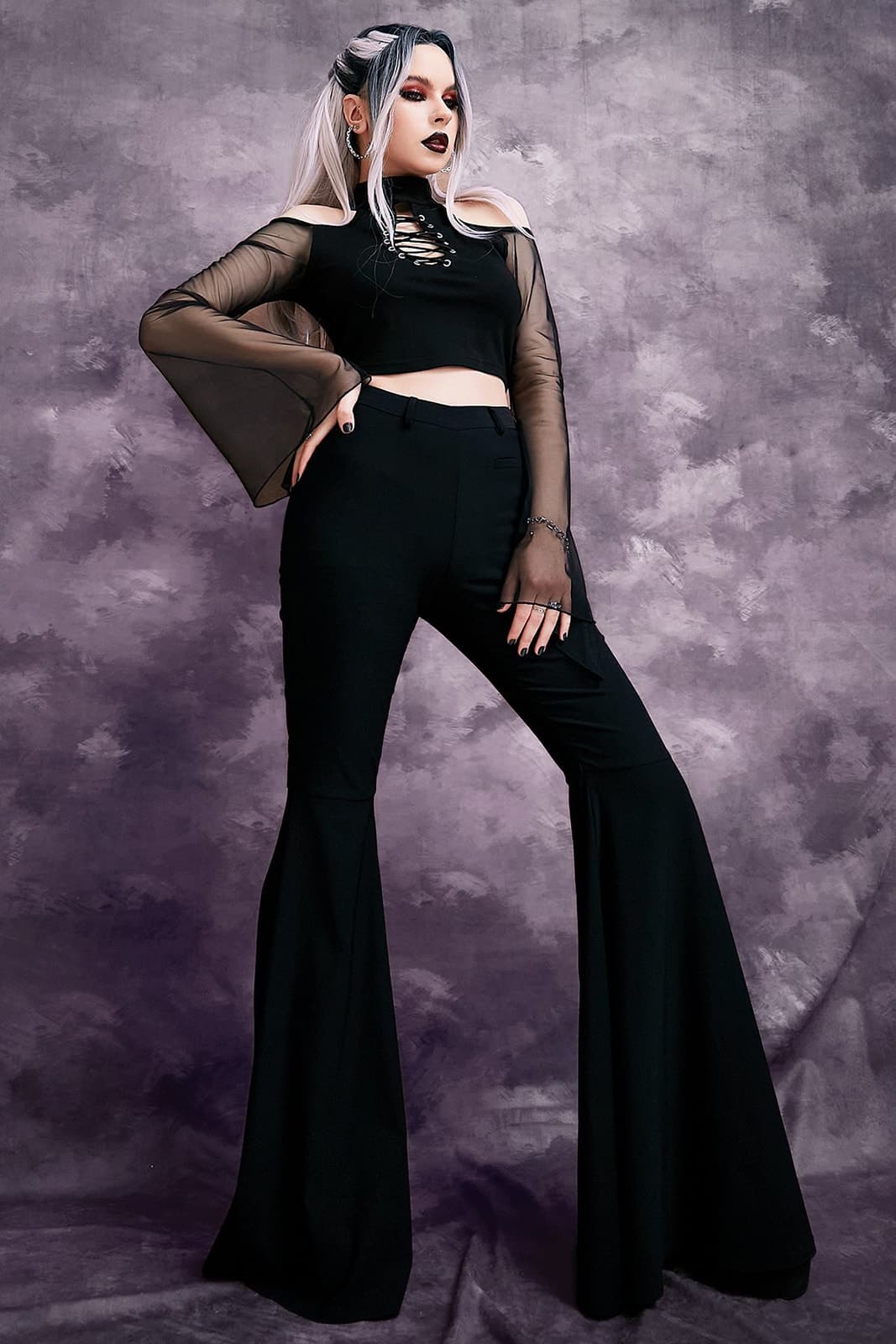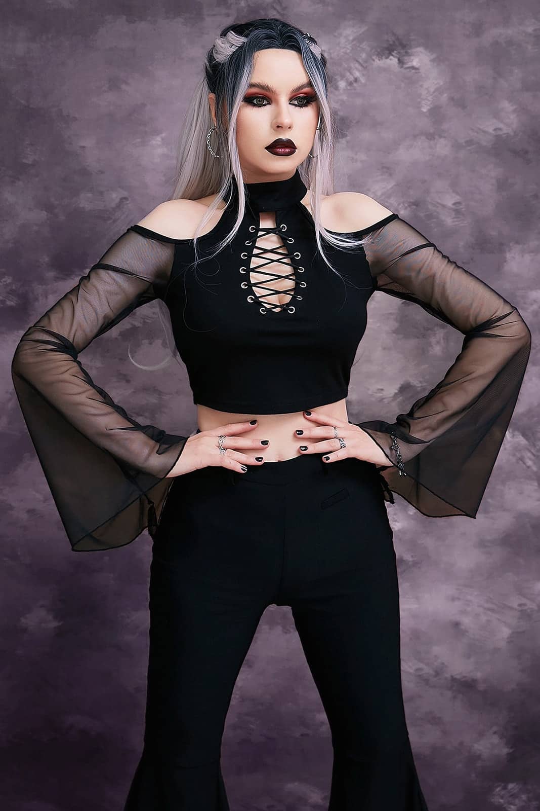 Schulterfreies Top aus weichem Gewebe mit einem wunderschön geformten Schlüssellochdetail am Ausschnitt. Die langen Ärmel sind aus transparentem Mesh-Gewebe gefertigt. Der hohe Halsausschnitt wird im Nacken verschlossen.