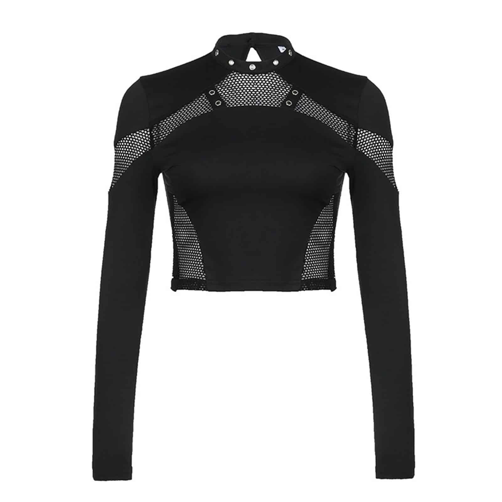 Langarm-Shirt mit Netzeinsatz oberhalb der Brust und an den Seiten. Der reizvolle Netzeinsatz erstreckt sich bis über die Oberarme. Der hoch geschnittene Rundhalsausschnitt ist mit silbernen Ösen besetzt.