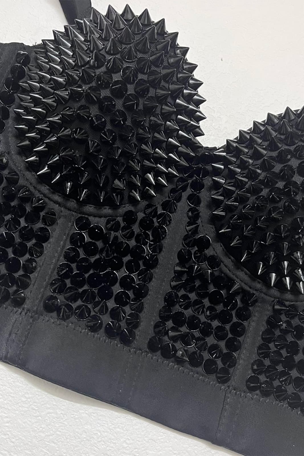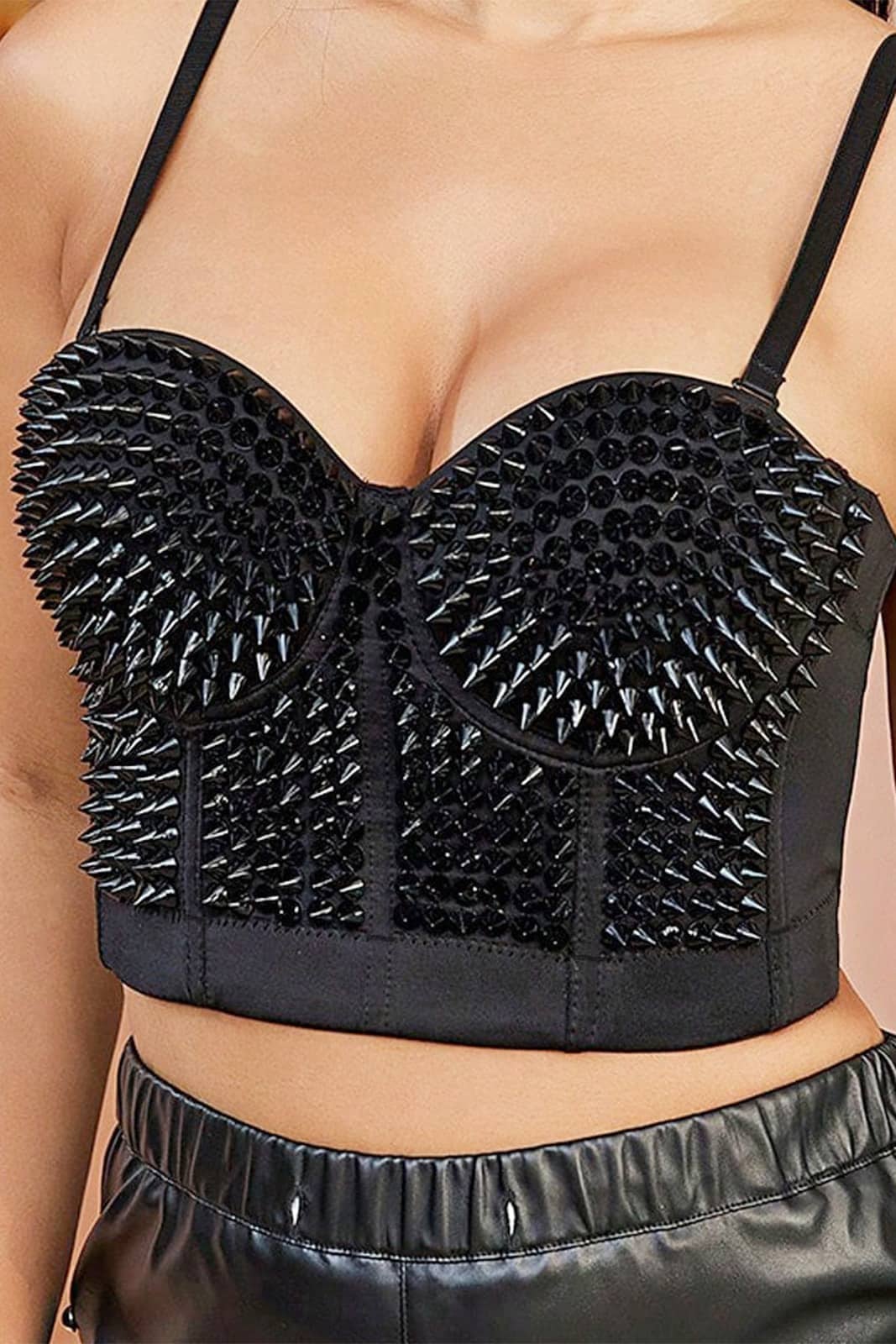 Dieses BH-Top ist ein echter Blickfang – sinnlich, rebellisch und kompromisslos edgy. Die Cups sind üppig mit glänzenden, schwarzen Kunststoff-Spitznieten besetzt, die je nach Lichteinfall ein kraftvolles Spiel aus Glanz und Schatten erzeugen. Die spitzen Details verleihen dem Top eine provokante, selbstbewusste Ästhetik im Stil der Gothic- oder Fetish-Mode. Dank der klassischen Haken- und Ösen-Verschlüsse auf der Rückseite sitzt das Top sicher und formschön. Ideal für gewagte Cluboutfits, Bühnenauftritte oder mutige Fashion-Statements.