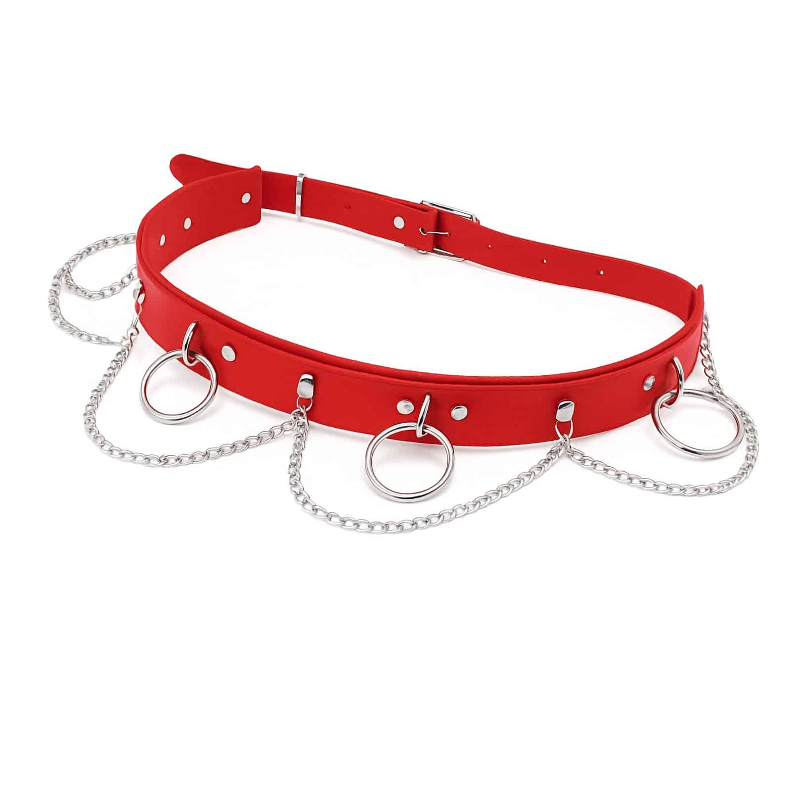 Dieser rote Gürtel kombiniert minimalistisches Design mit provokativer Attitüde. Große silberne O-Ringe und locker fallende Ketten verleihen ihm einen markanten, industriellen Look. Das verstellbare Band sorgt für flexiblen Sitz an Hüfte oder Taille und macht ihn zum perfekten Accessoire für düstere Streetstyles, Club-Outfits oder Festival-Looks. Ein Must-have für alle, die ein Statement setzen wollen.
