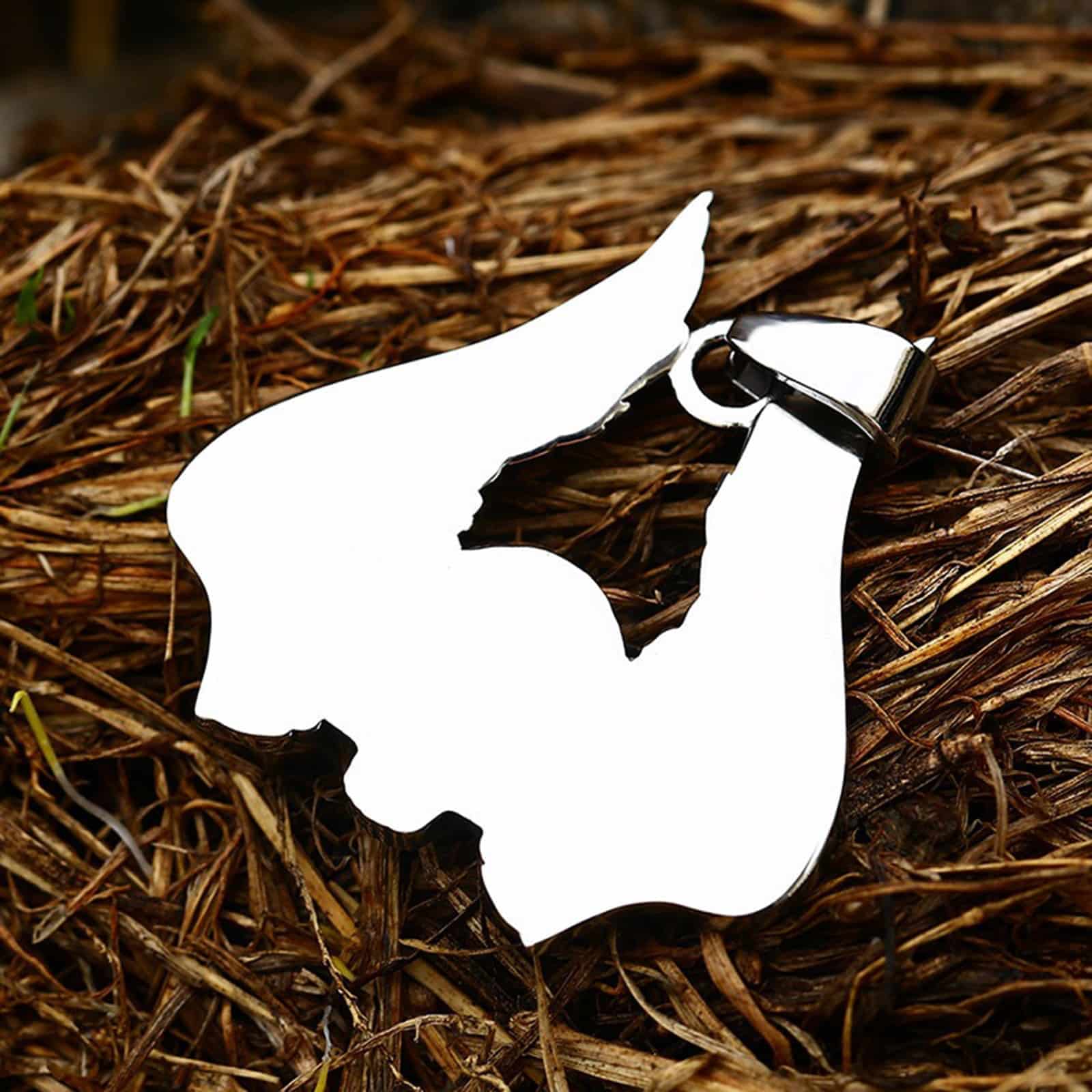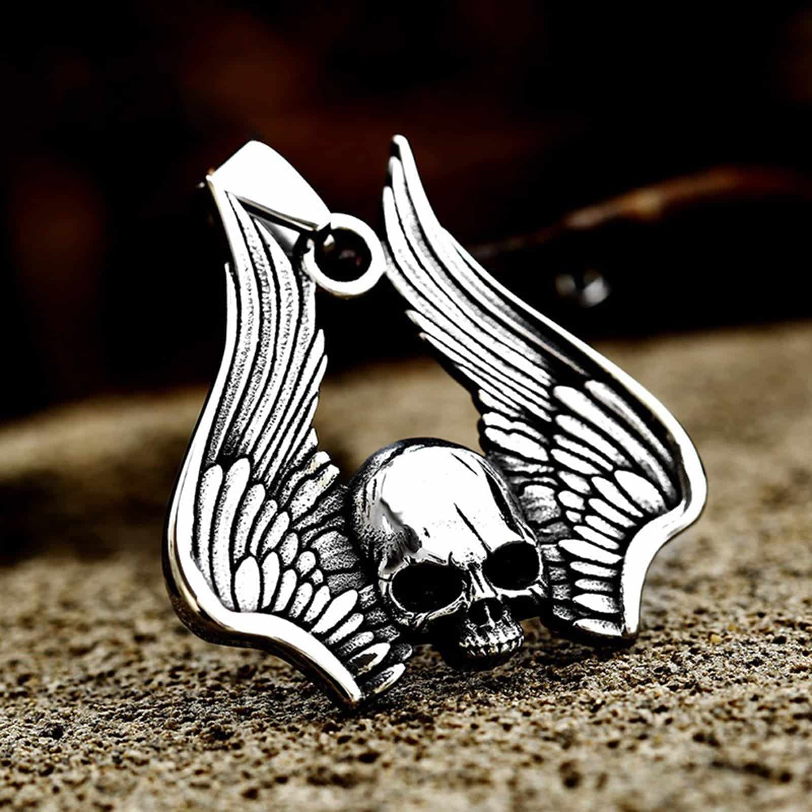 Detaillierter Anhänger aus rostfreiem Stahl in Form eines geflügelten Totenschädels.