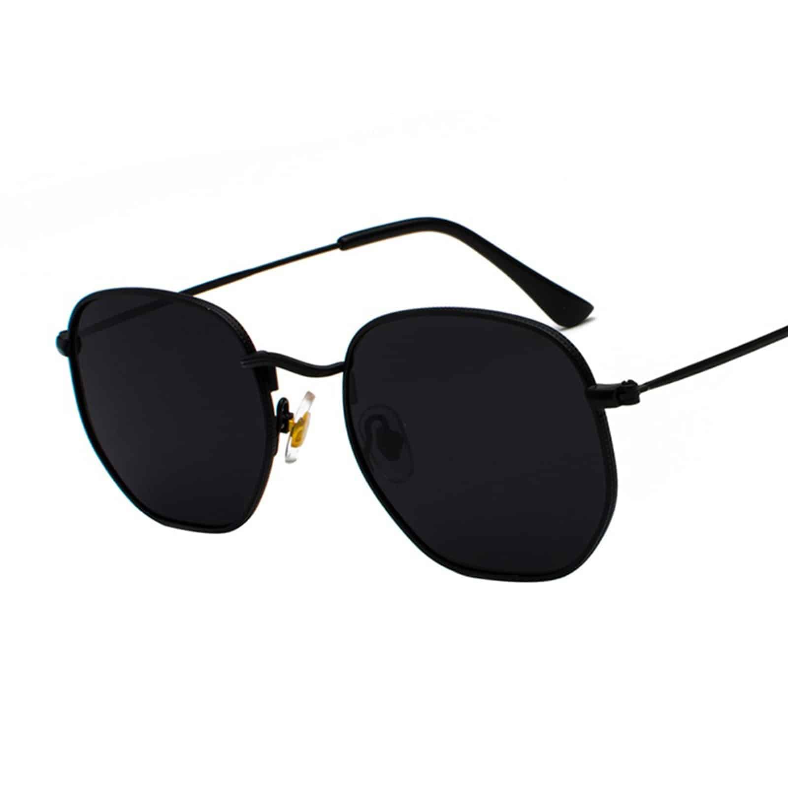 Außergewöhnliche Sonnenbrille mit leicht eckigem Vollrand. Mit filigranen schwarzen Bügeln und schwarzen Gläsern.