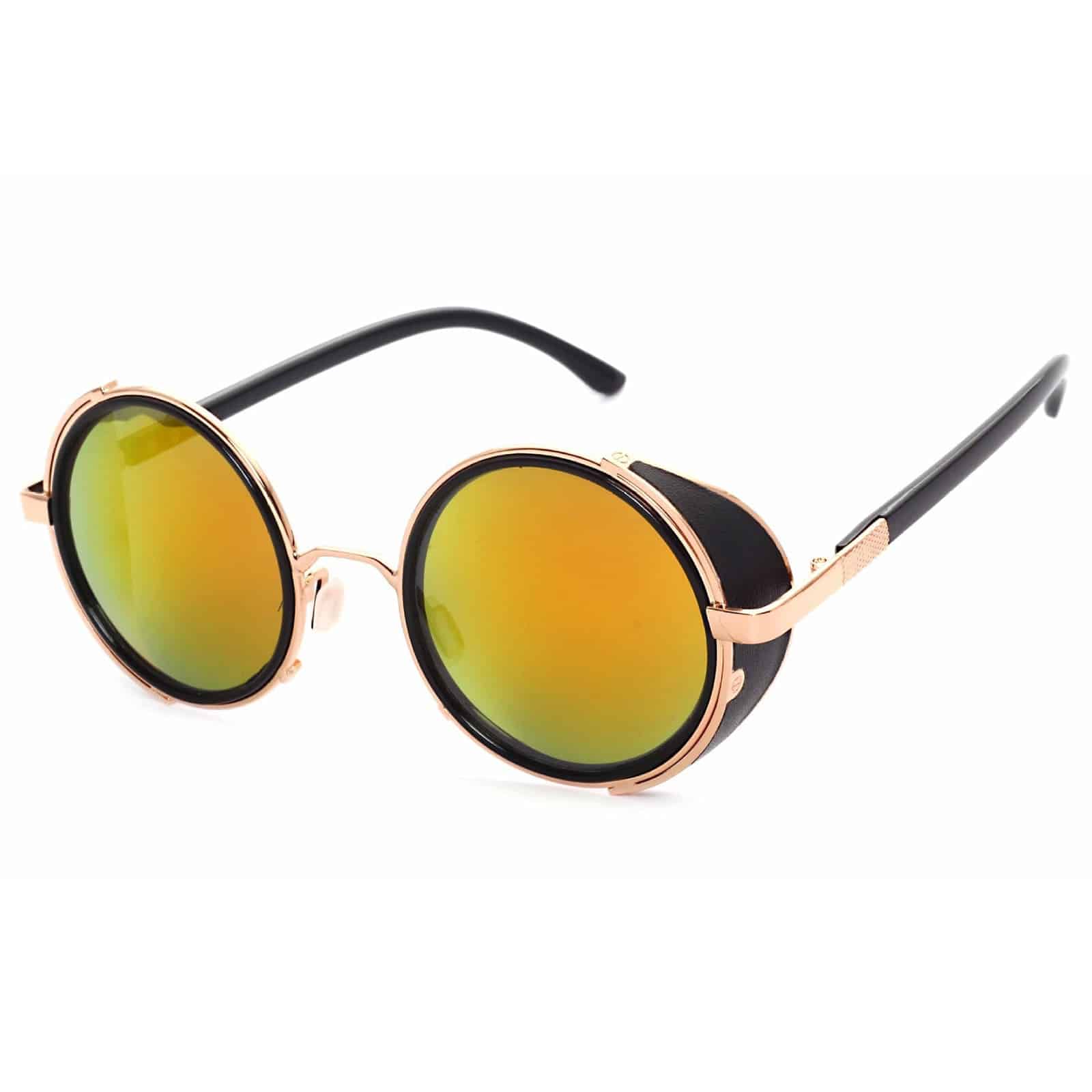 Außergewöhnliche Sonnenbrille mit Vollrand und seitlichem Blendschutz. Mit filigranen schwarzen Bügeln und goldenen, erspiegelten Gläsern.