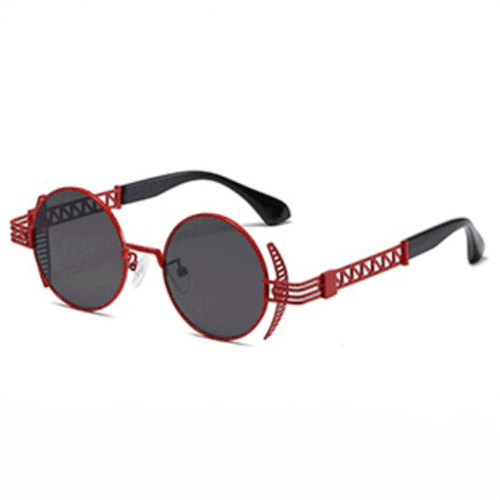 Außergewöhnliche Sonnenbrille in rot mit dunklen Gläsern im Vollrahmen und seitlichem Blendschutz.