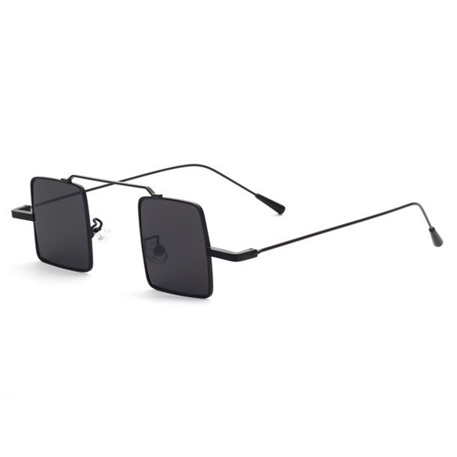 Außergewöhnliche Sonnenbrille mit leicht eckigem Vollrand. Mit filigranen schwarzen Bügeln und schwarzen Gläsern.