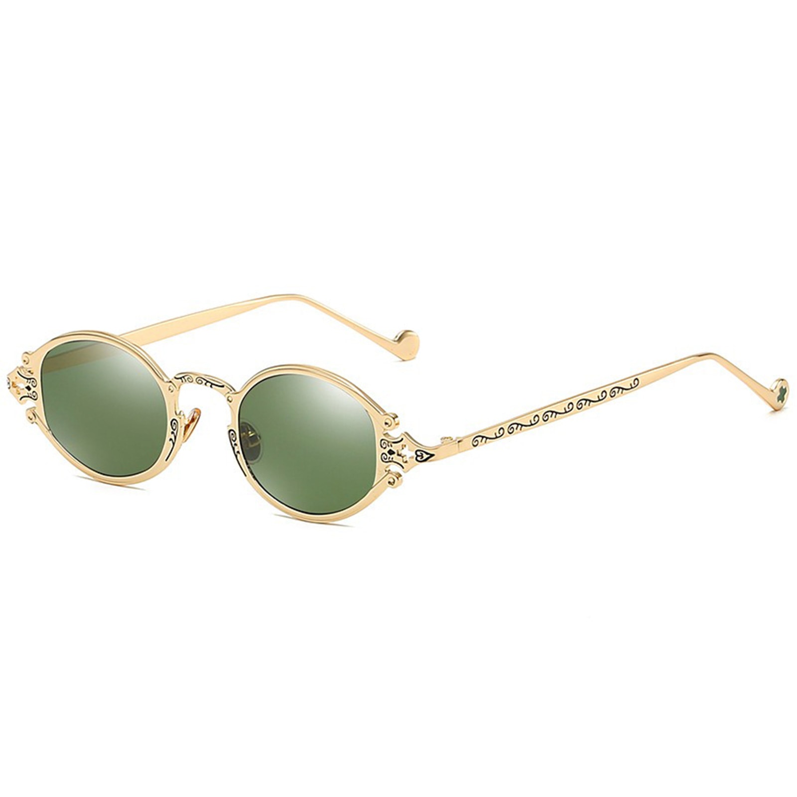 Außergewöhnliche Sonnenbrille mit Vollrand. Mit filigranen, verzierten goldenen Bügeln und grünen Gläsern.
