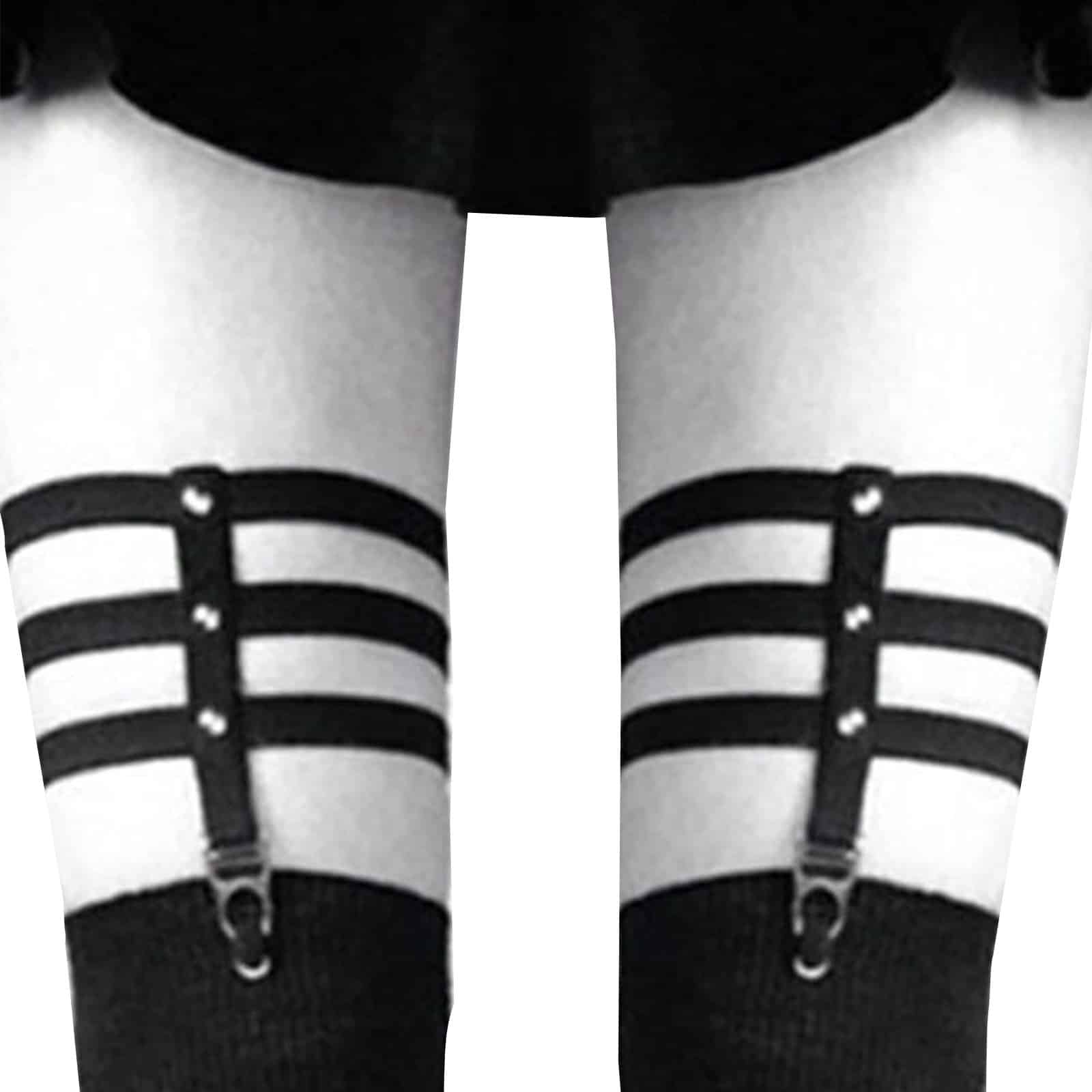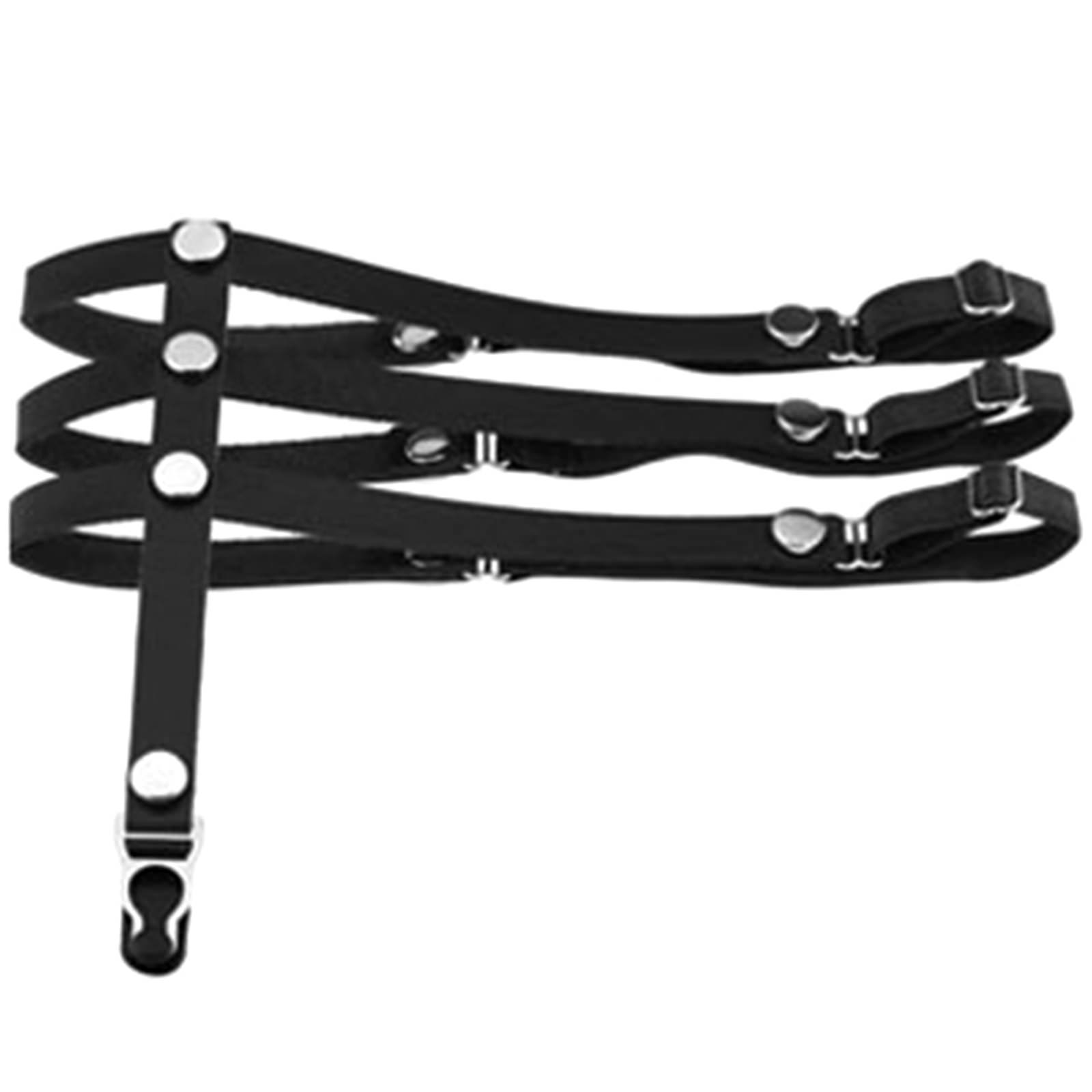 Auffälliger Strumpfhalter der an der Vorderseite aus Kunstleder-Riemen hergestellt ist. Auf der Rückseite sind elastische und verstellbare Gummizüge verarbeitet.