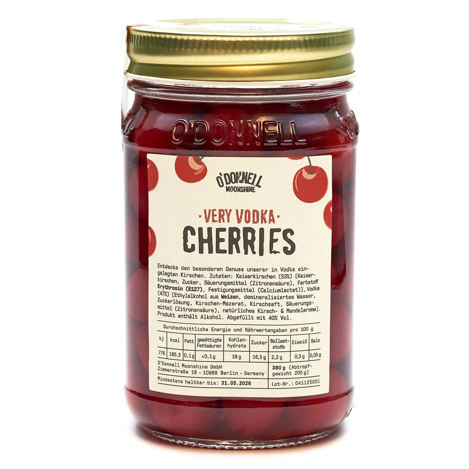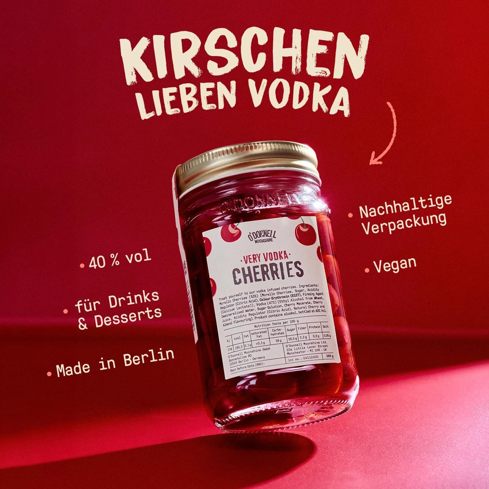 Entdecke die Very Vodka Cherries: knackige, saftige Kirschen, eingelegt in unserem 40% Moonshine Vodka – ein Duo, das gleich zwei Köstlichkeiten in einem Mason Jar vereint: aromatischen Kirschvodka und fruchtig-süße Vodka-Kirschen.